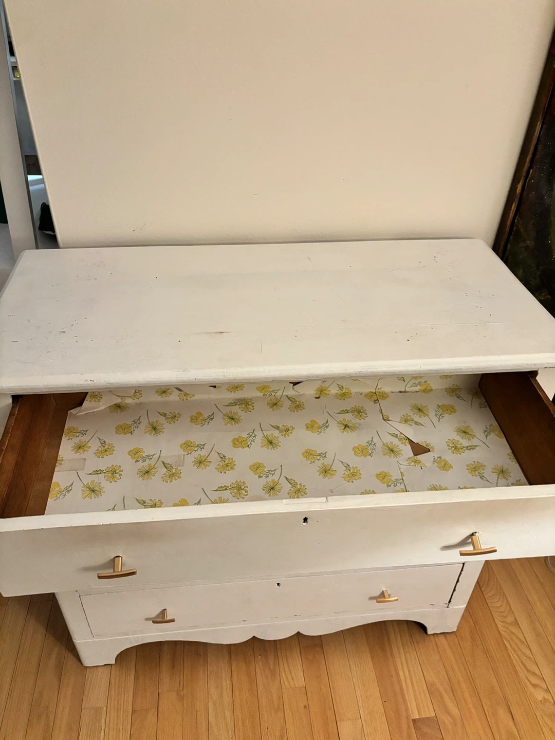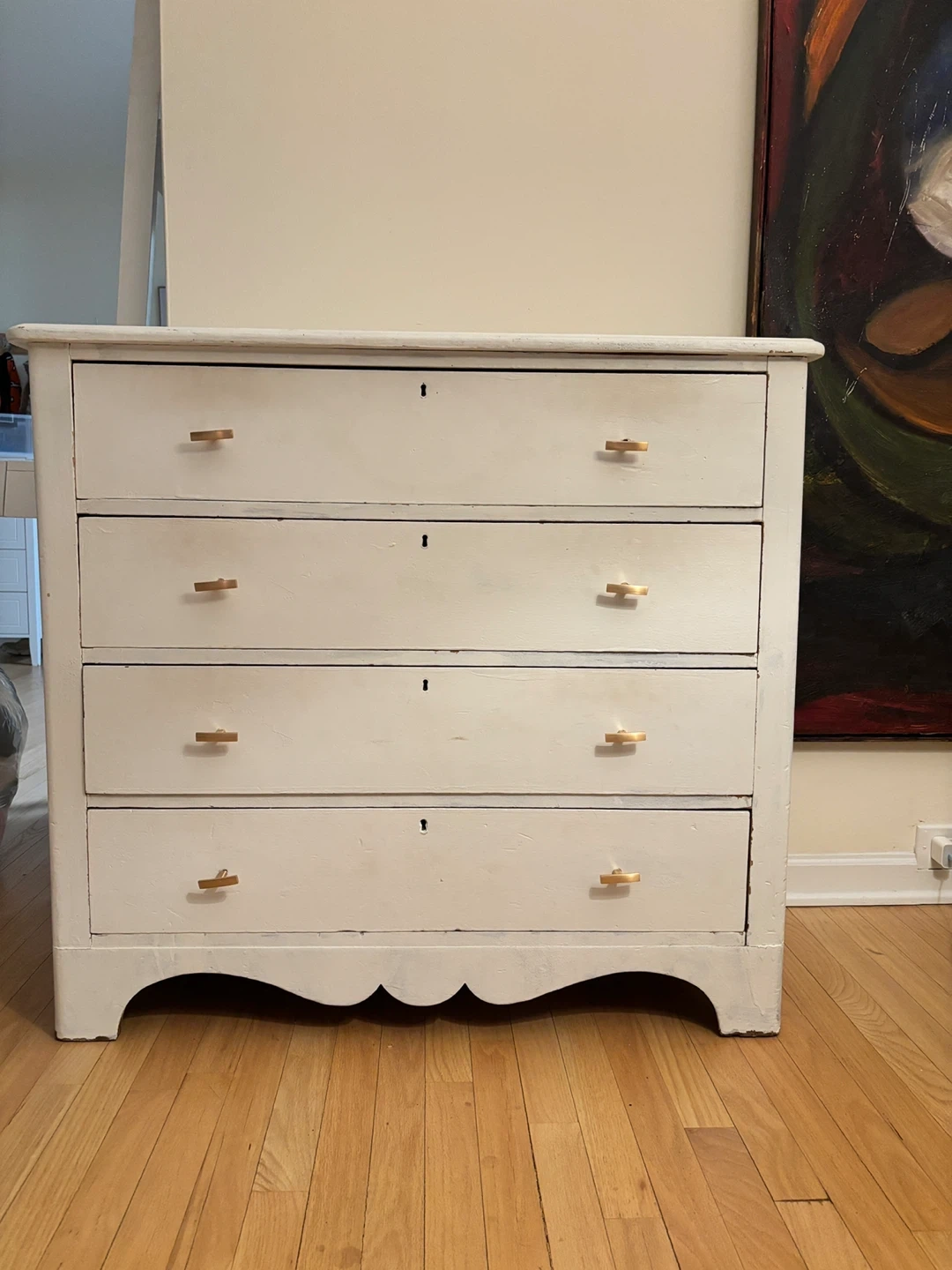 Vintage dresser with great bones and a beautiful dark wooden stain underneath the paint, four drawers and a decorative base. A furniture flipper’s dream, hoping to sell to someone willing to restore her to her former glory !