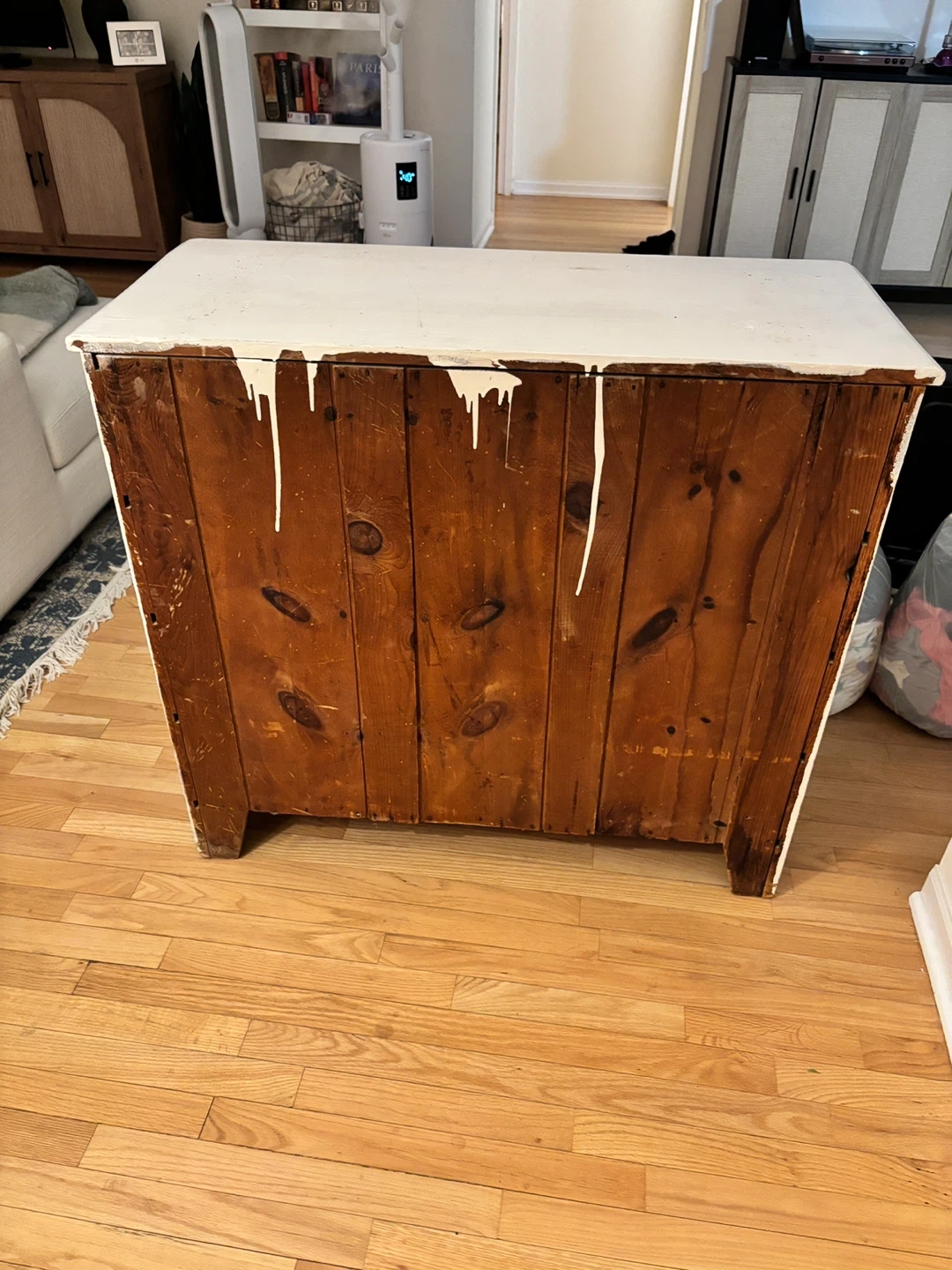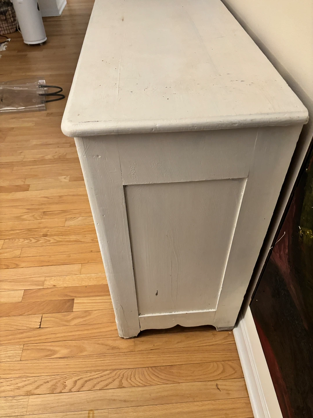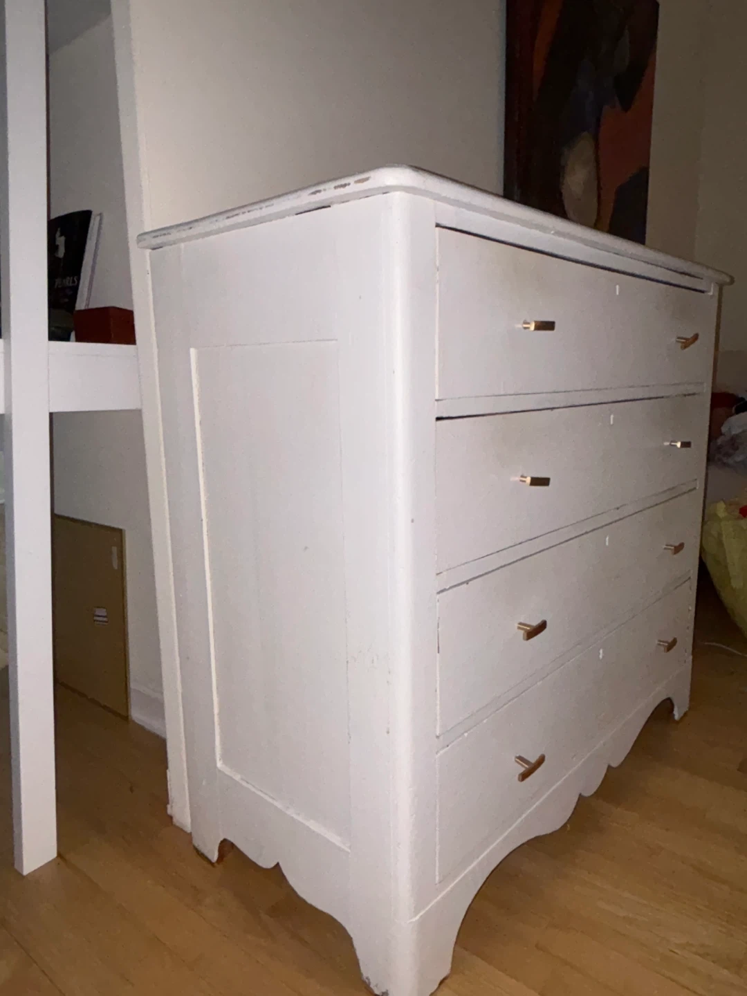 Vintage dresser with great bones and a beautiful dark wooden stain underneath the paint, four drawers and a decorative base. A furniture flipper’s dream, hoping to sell to someone willing to restore her to her former glory !