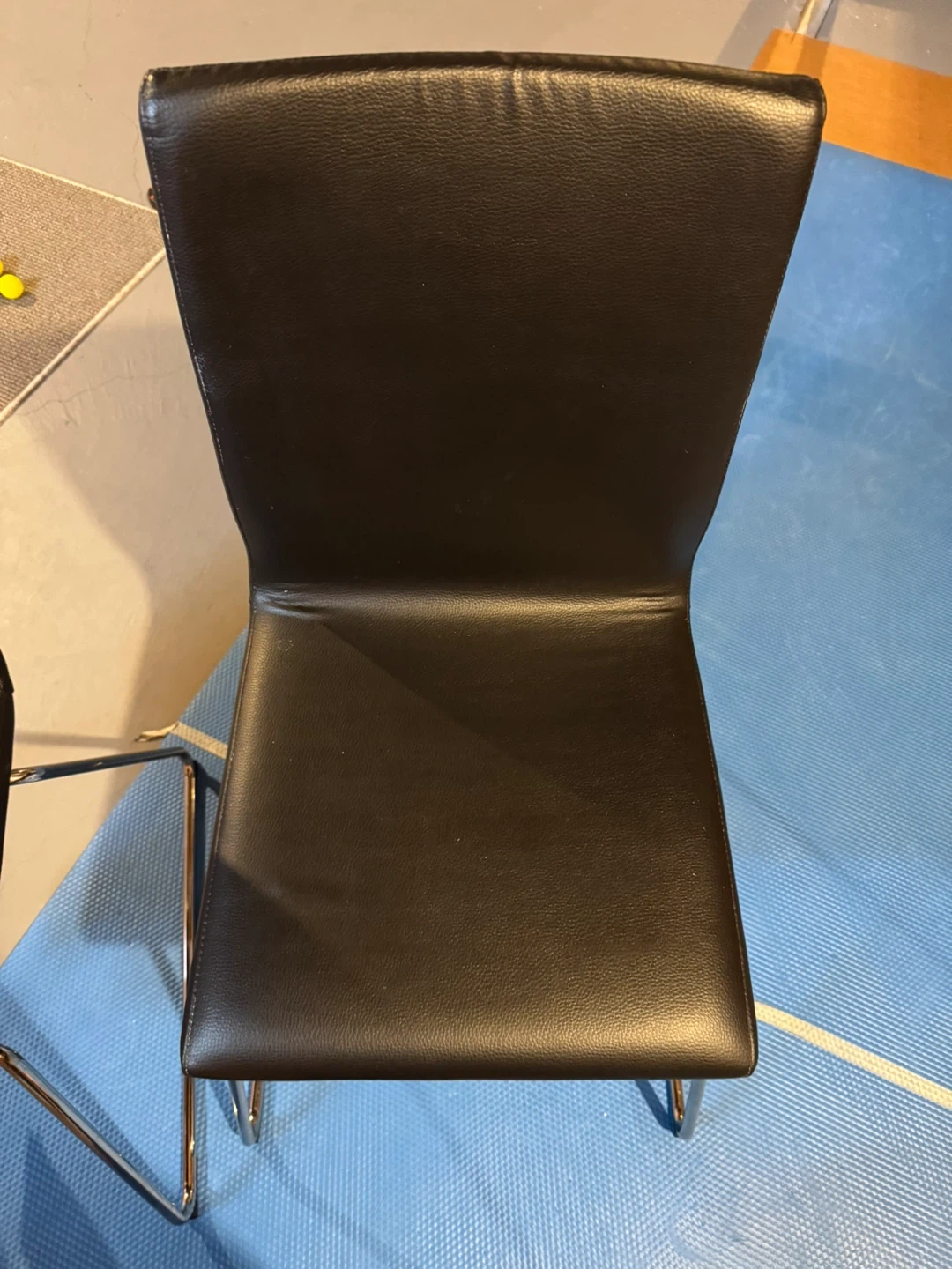 Selling a set of two dark brown artificial leather dining chairs! They're in good condition and would look great in any dining room or kitchen. The sleek design with chrome legs adds a modern touch