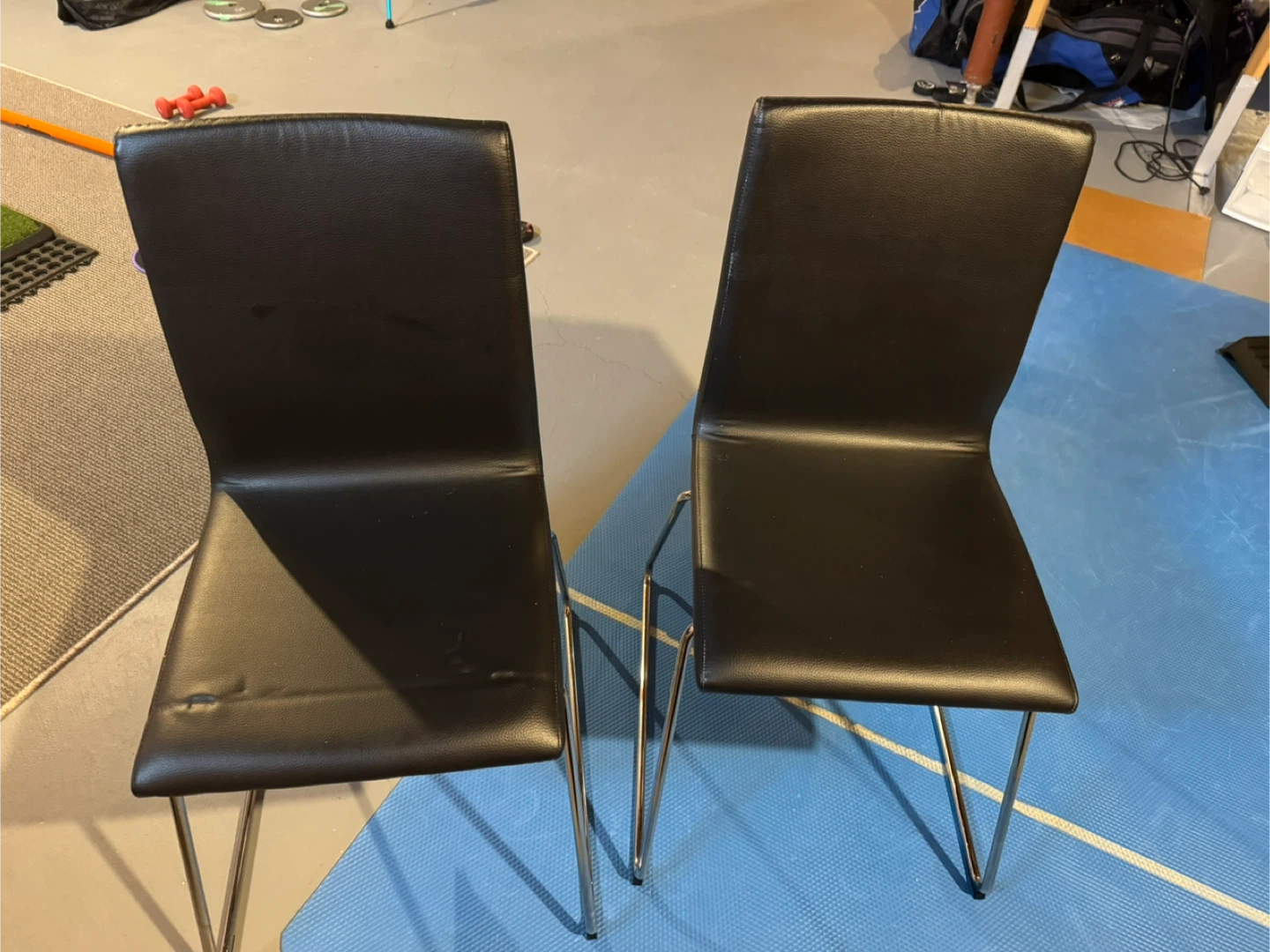 Selling a set of two dark brown artificial leather dining chairs! They're in good condition and would look great in any dining room or kitchen. The sleek design with chrome legs adds a modern touch