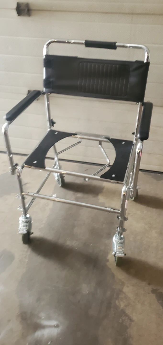 This commode chair features a durable chrome-plated steel frame and padded armrests for comfort. It includes a removable bucket and splash guard. The wheels allow for easy transport. This chair is useful for individuals needing mobility assistance.