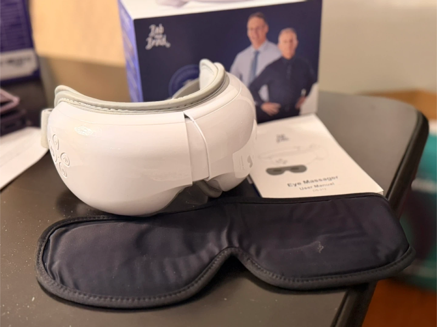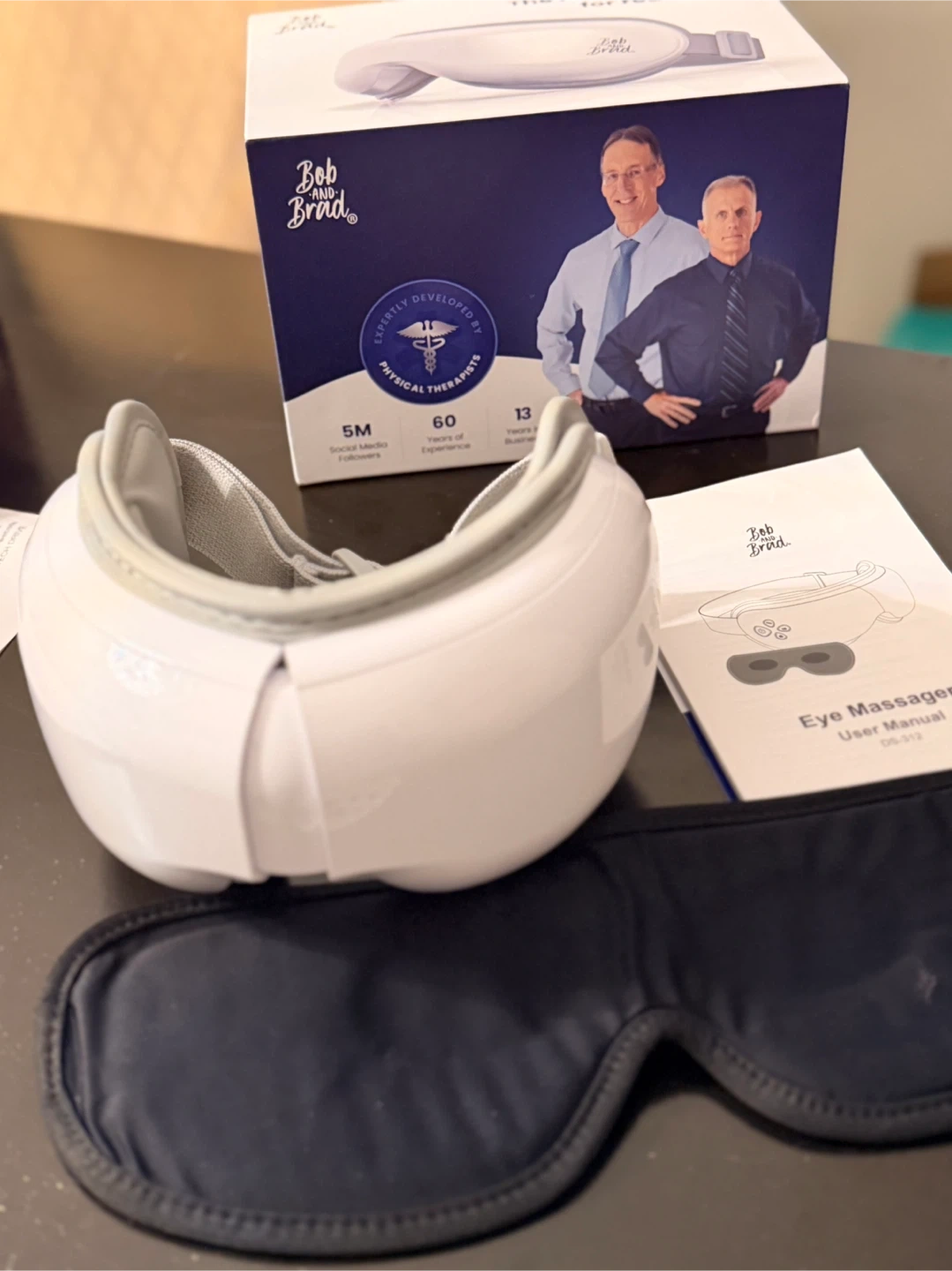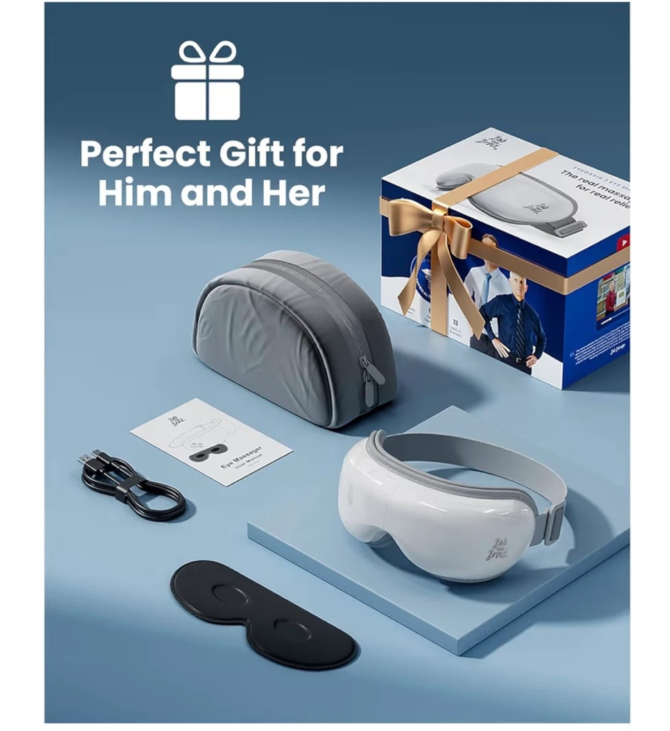 The Bob and Brad Eye Massager is designed for relaxation on-the-go! It features easy-to-use physical buttons for power, volume, pressure, and heat control. The 180° foldable design and enhanced protection make travelling relaxing. It comes with a user manual and a sleeping mask, travel bag and the box is included