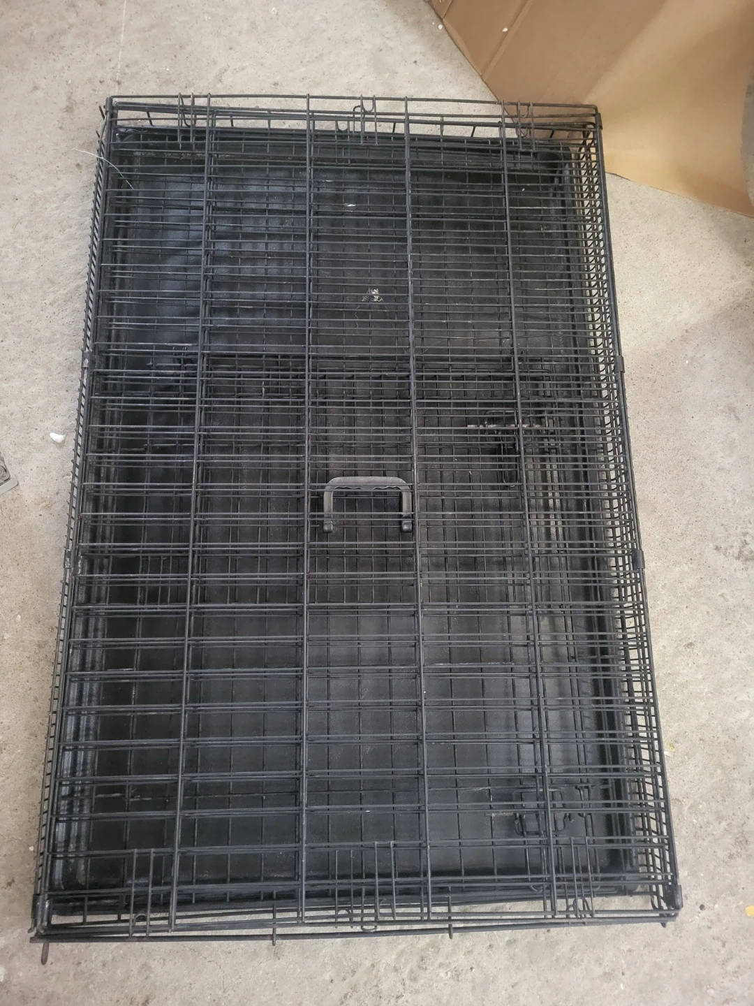 This is a standard wire dog crate with a black plastic tray. It's foldable for easy storage. Includes a front-access door with a secure latch. Provides a safe space for pets.