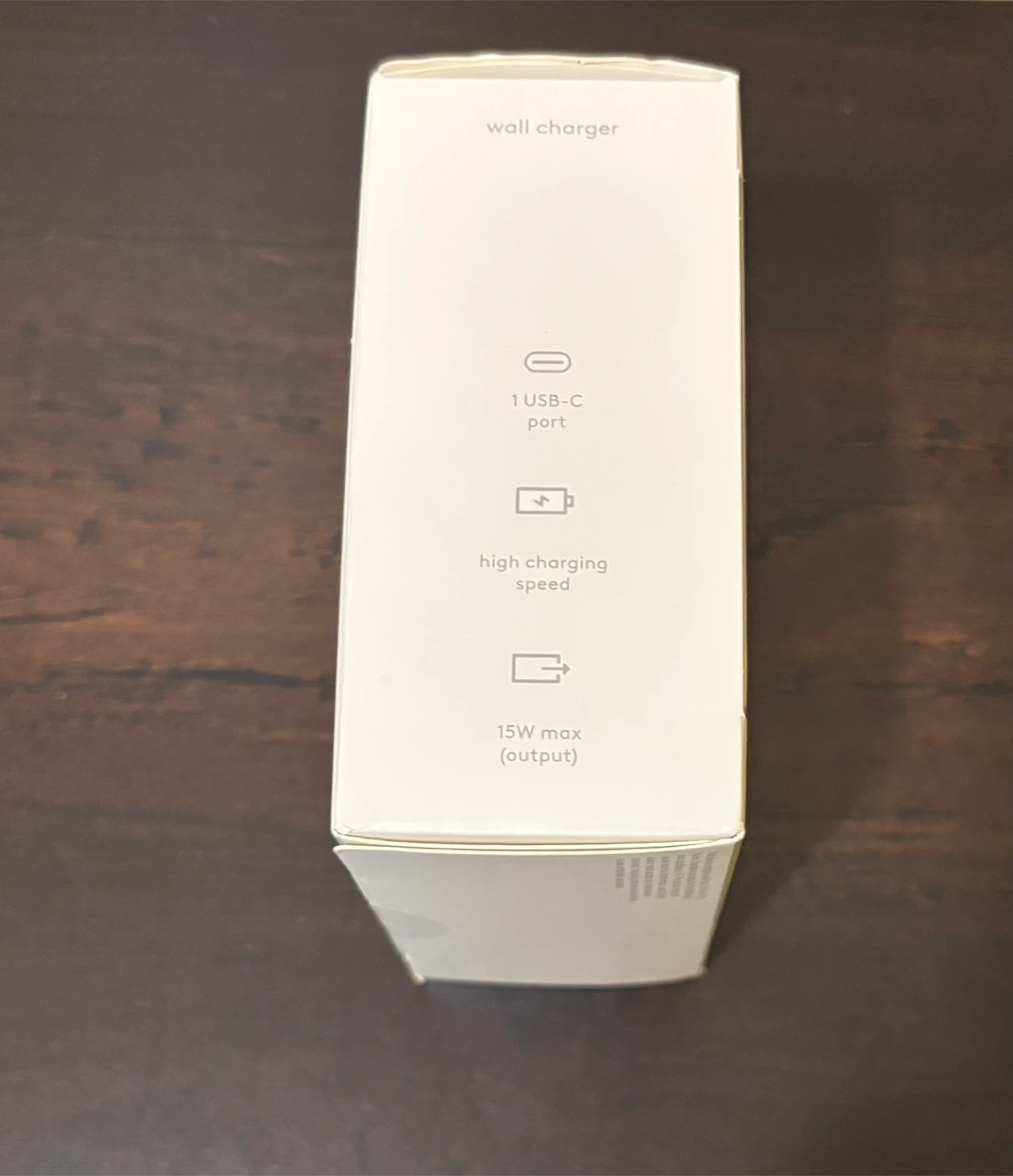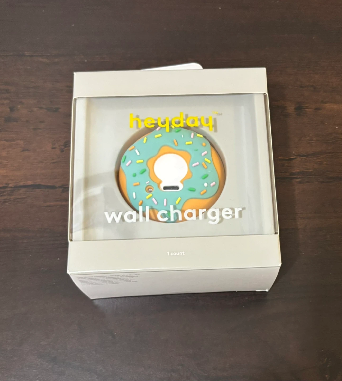 This is a Heyday wall charger with a fun donut design. It's teal with colorful sprinkles. It has one USB-C port and supports high charging speed with a 15W max output. It's a single count charger.