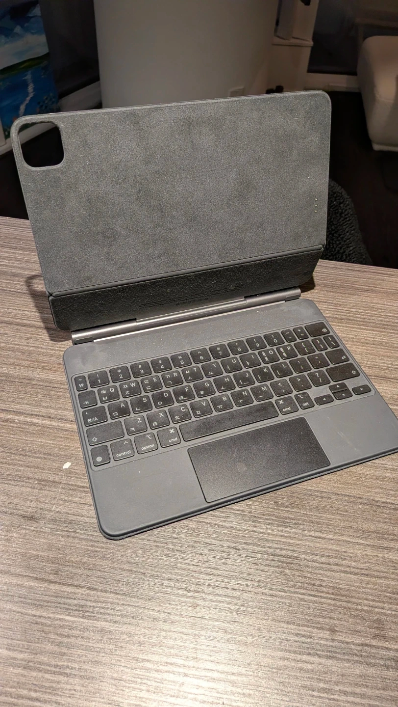 This is an Apple Magic Keyboard for iPad Pro. It's a grey, folio-style keyboard case with a built-in trackpad. It connects magnetically for a seamless user experience. Use it for typing and navigating your iPad.