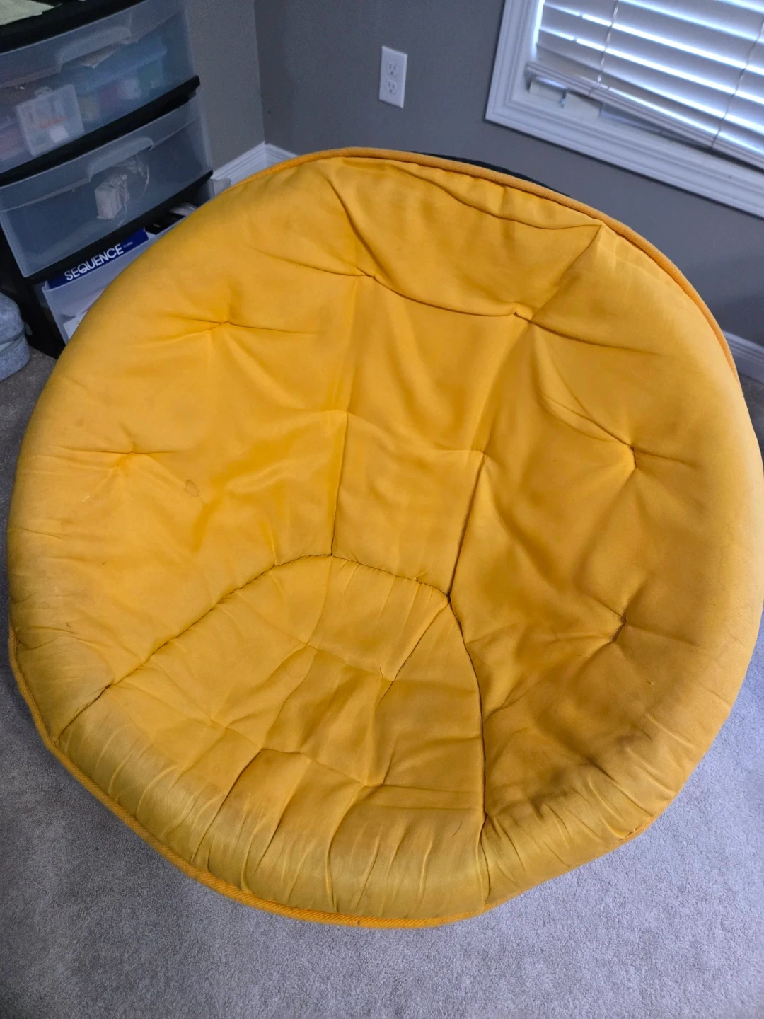 This is a yellow saucer chair with a metal frame. It's perfect for a reading nook or a casual seating area. The fabric is soft and the chair is lightweight for easy moving. It's a fun pop of color for any room!