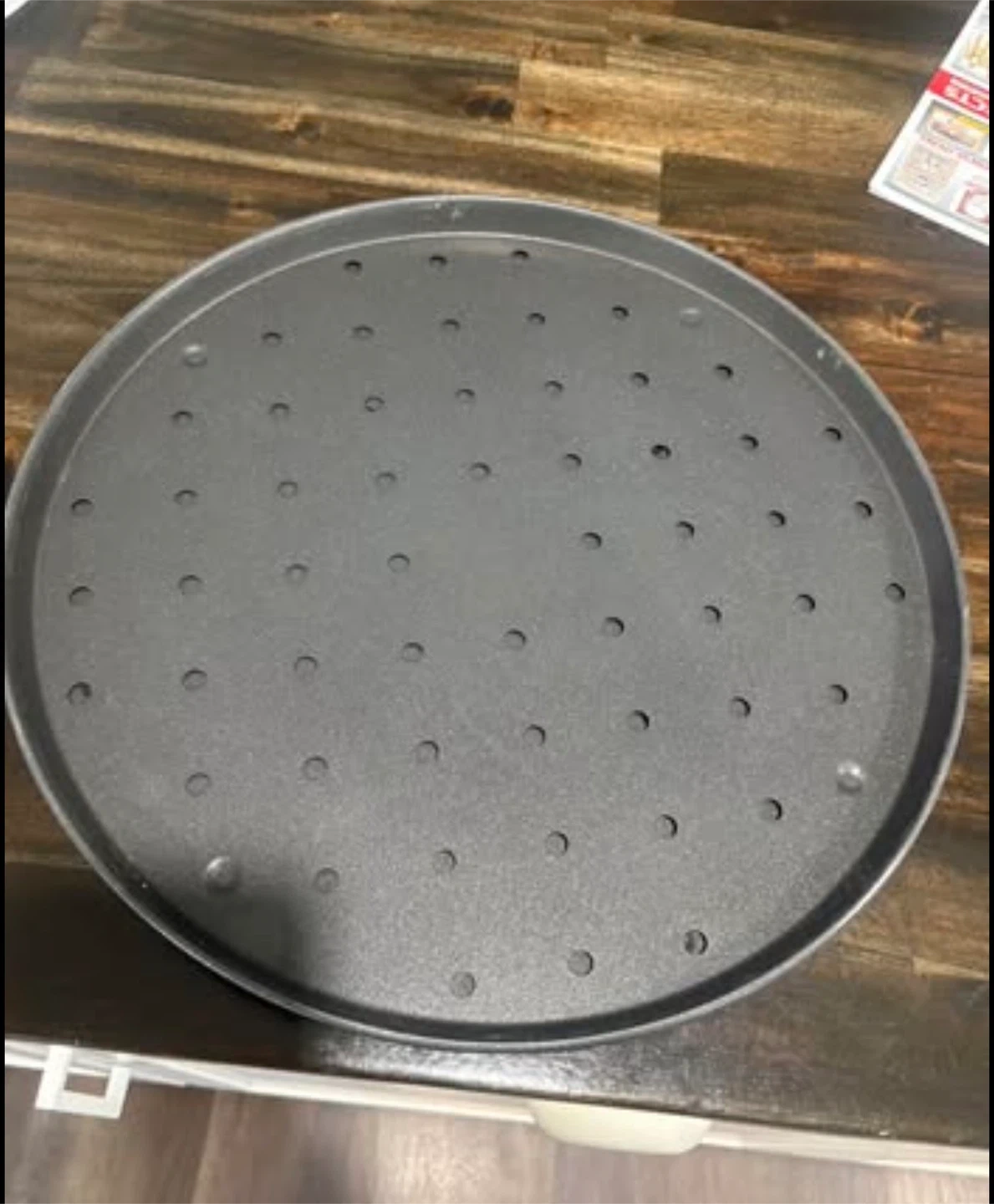 This is an IKEA MÄNTAGG pizza crisper pan. It's dark gray with a non-stick coating. The pan is 37 cm (15") across and has perforations to help crisp pizza crusts. It's useful for baking pizzas at home!