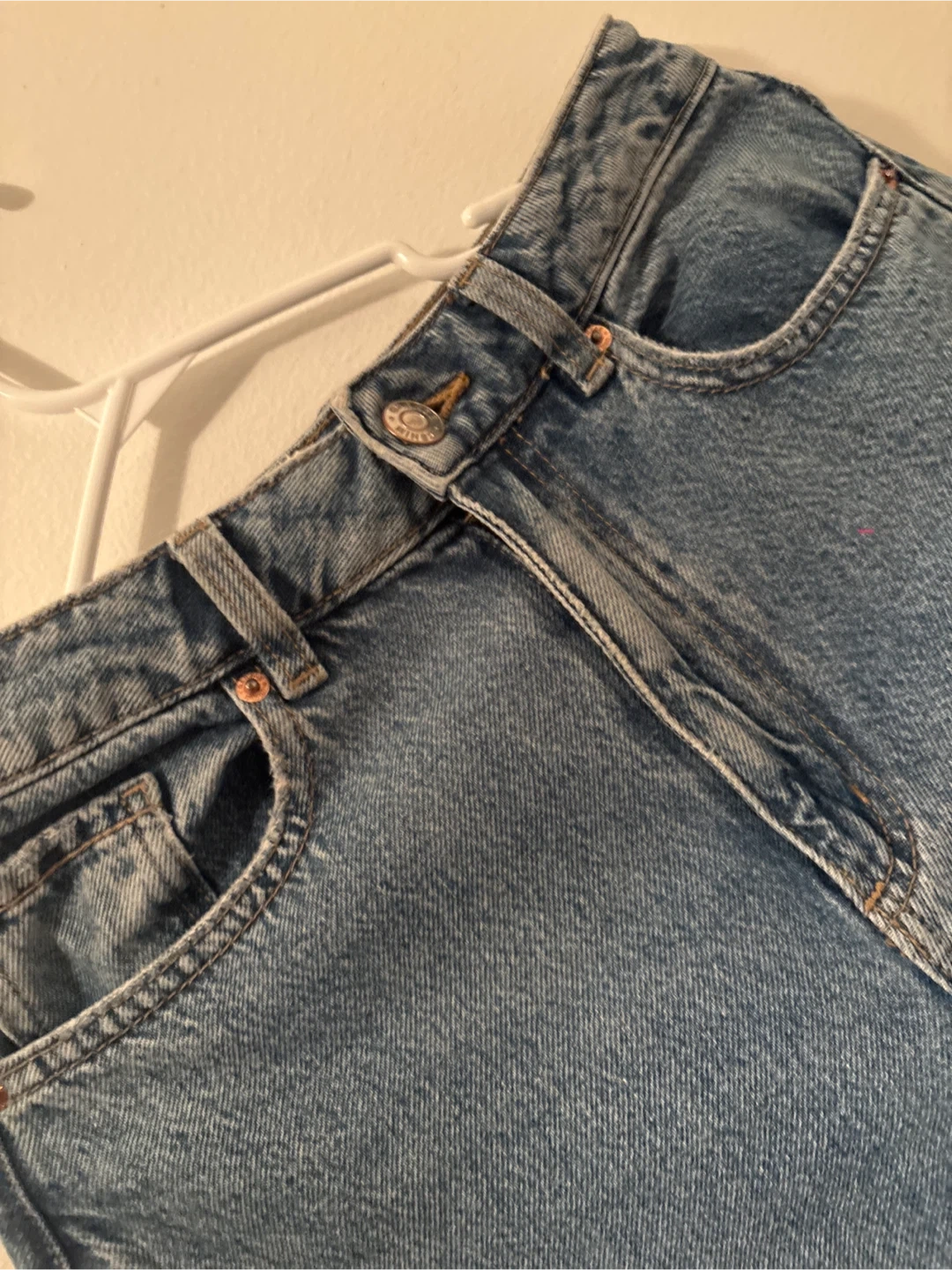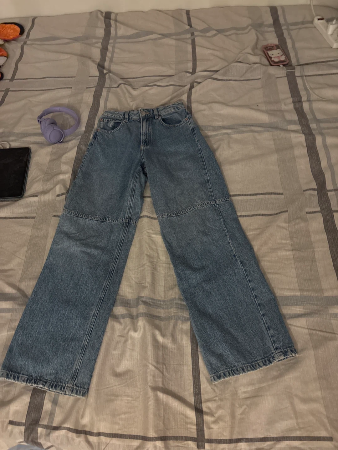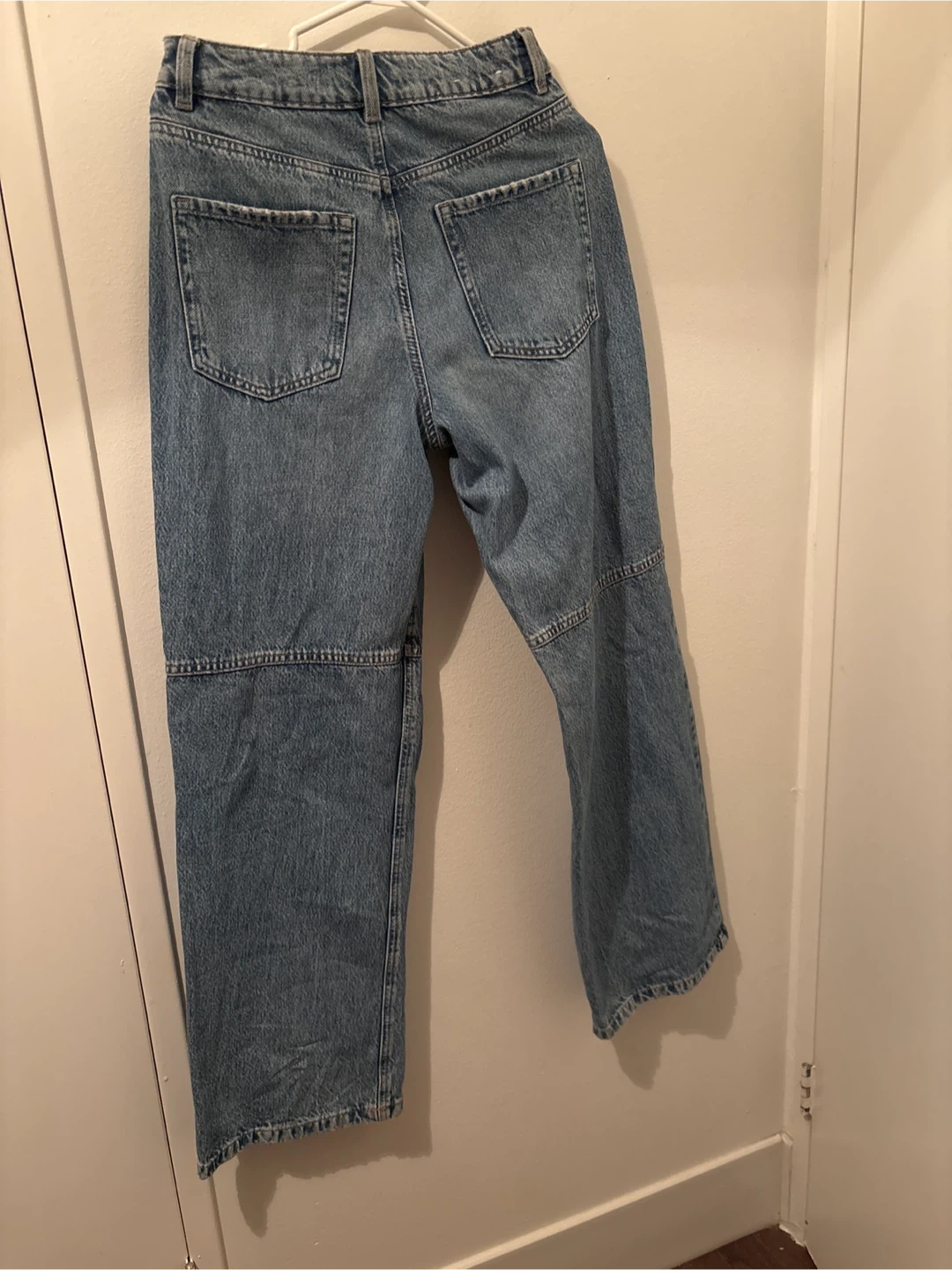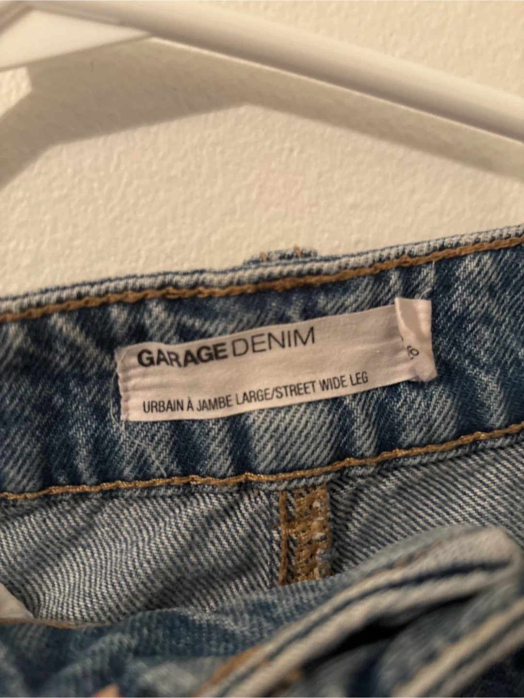 Garage Denim jeans in a light wash. They're a street wide leg style with a comfortable fit. Denim material.