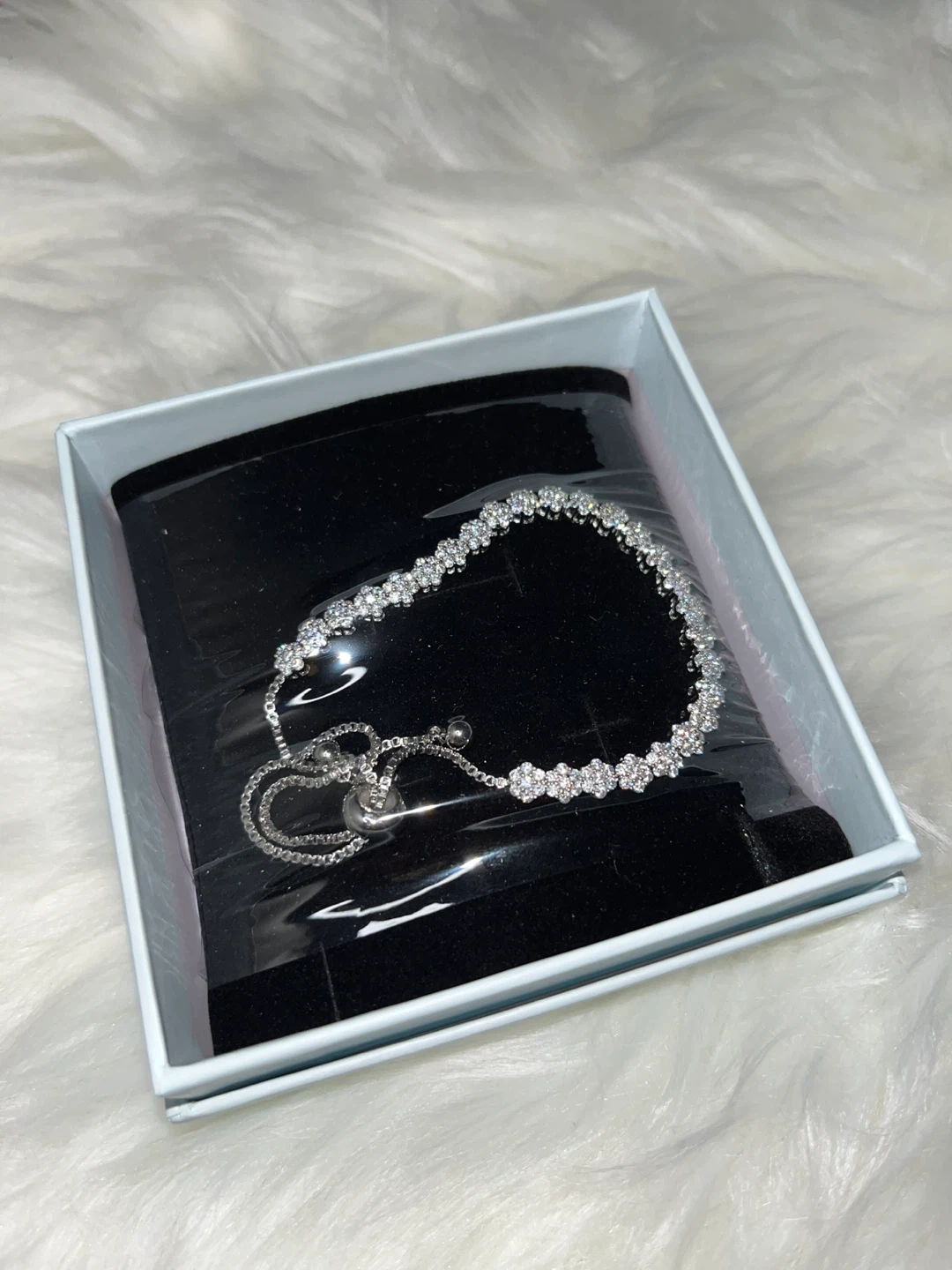 Sparkly bracelet with adjustable pull clasp. It's adorned with clear rhinestones in a floral pattern. Comes with a gift box.