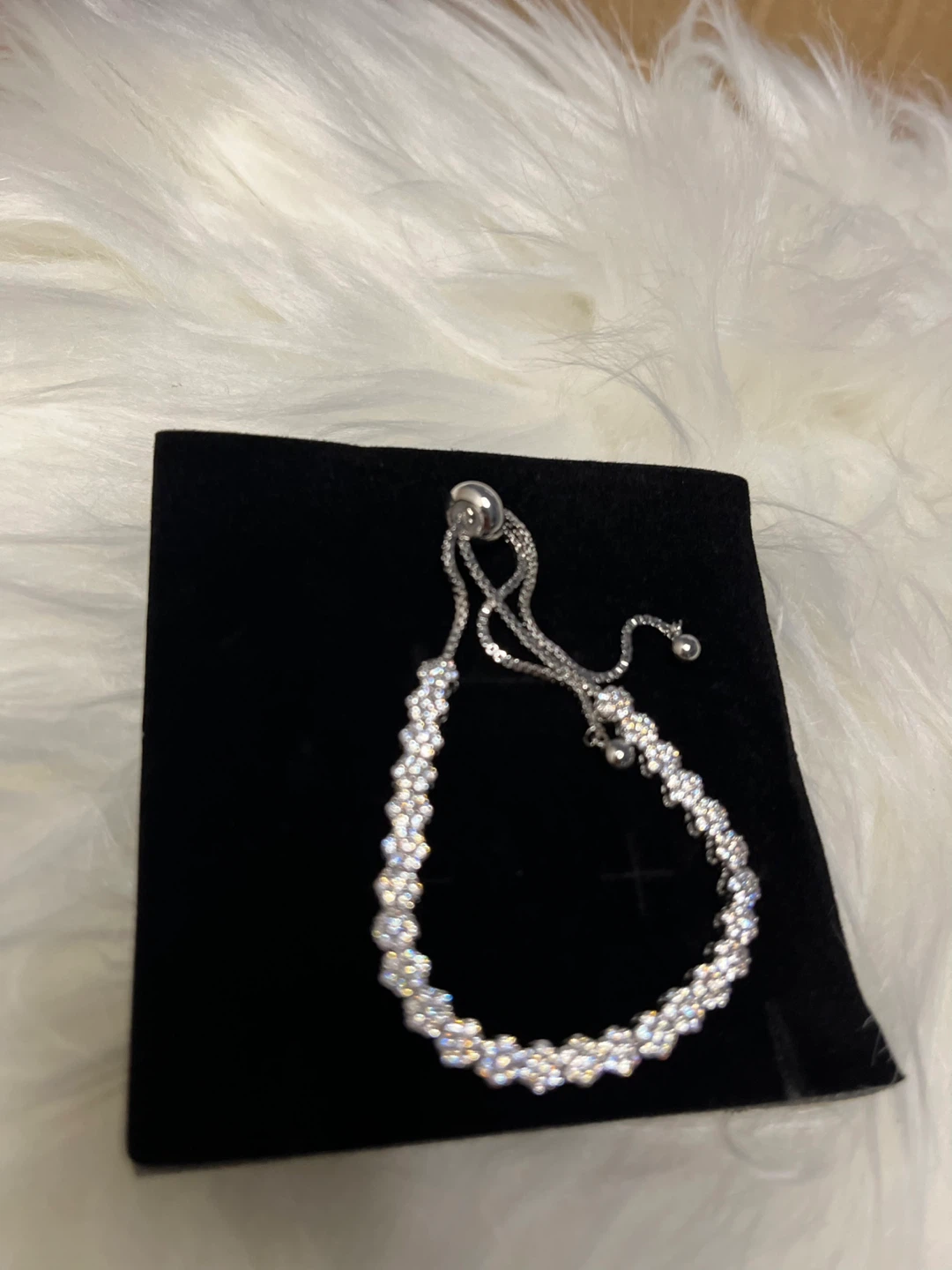 Sparkly bracelet with adjustable pull clasp. It's adorned with clear rhinestones in a floral pattern. Comes with a gift box.
