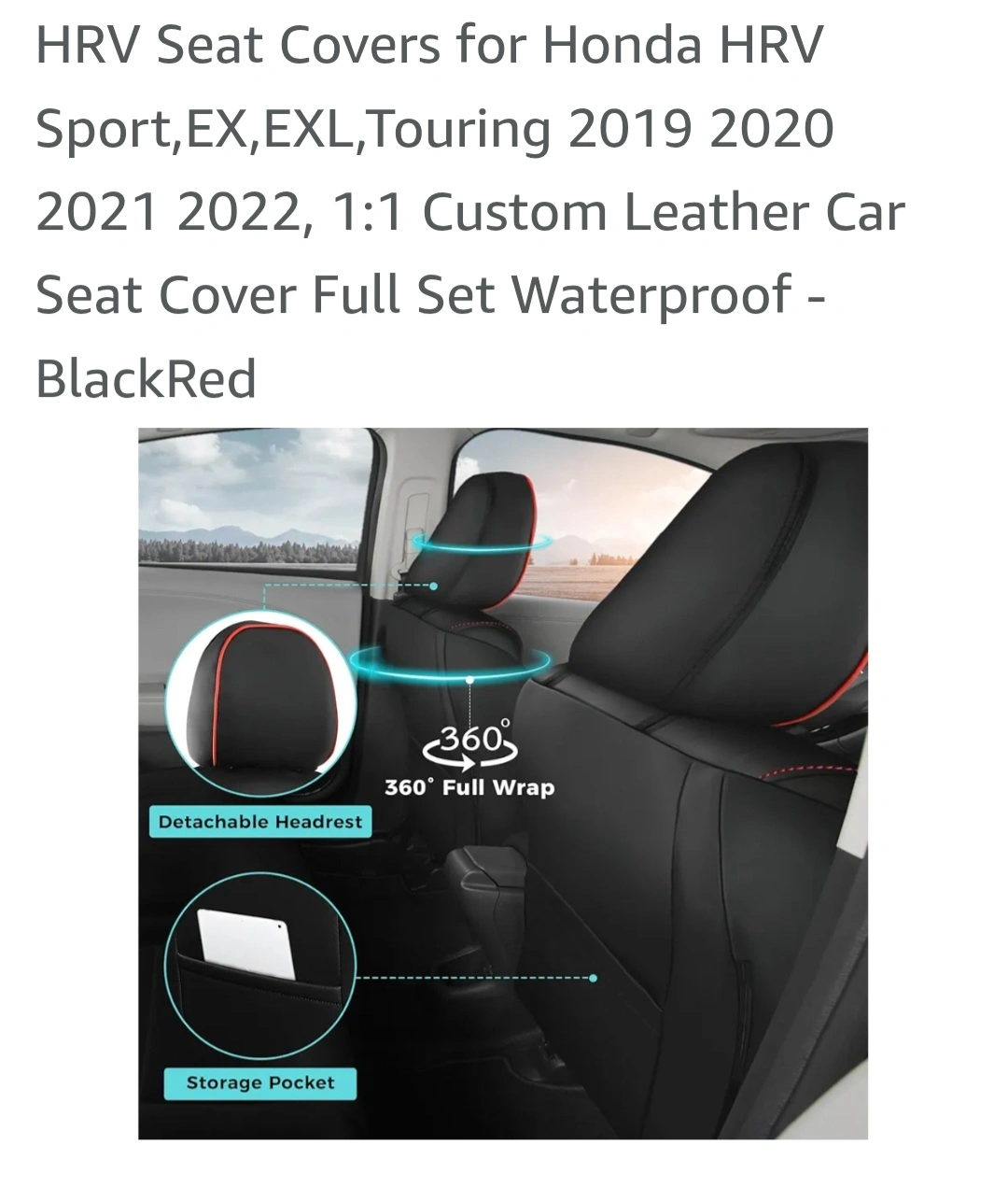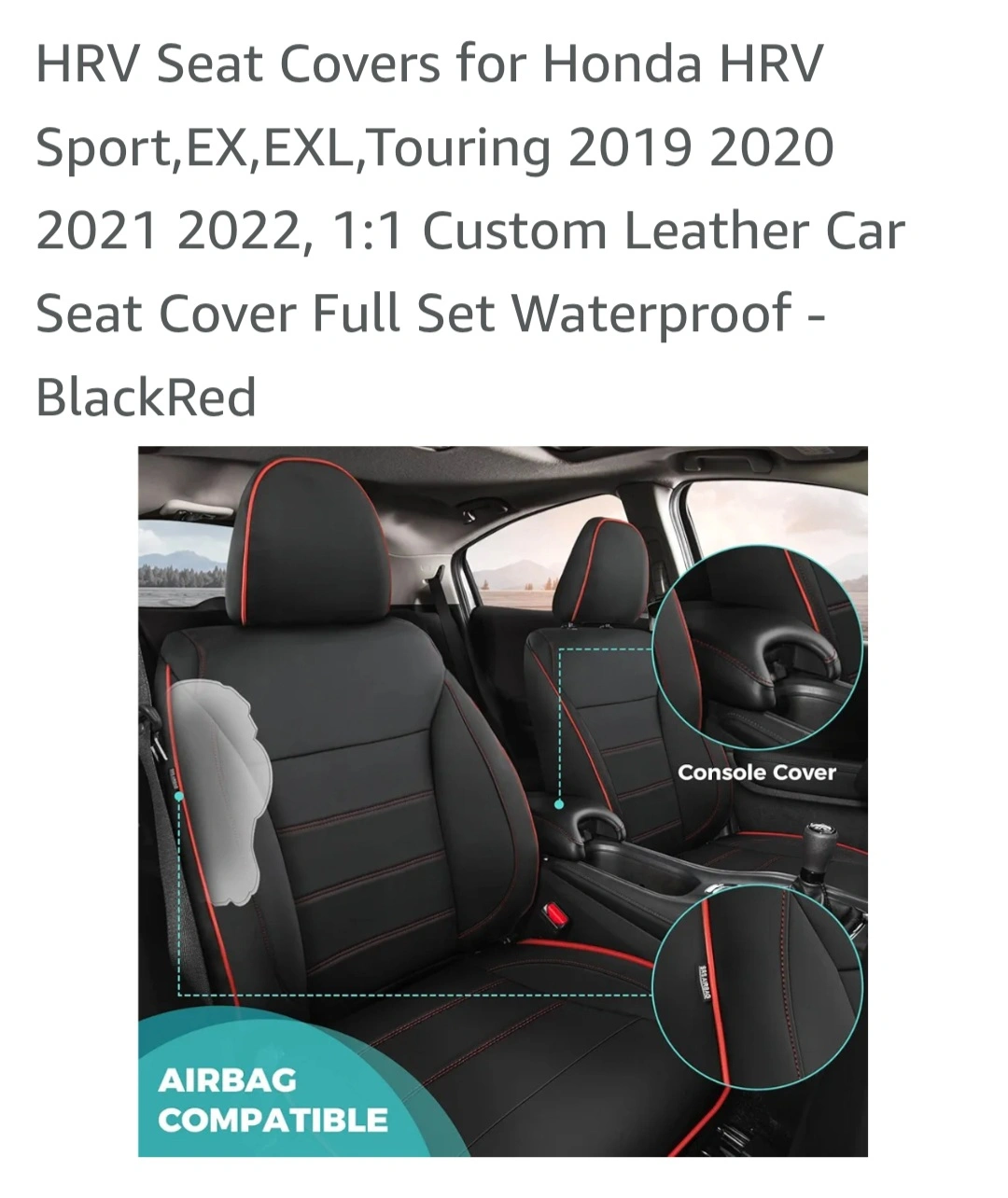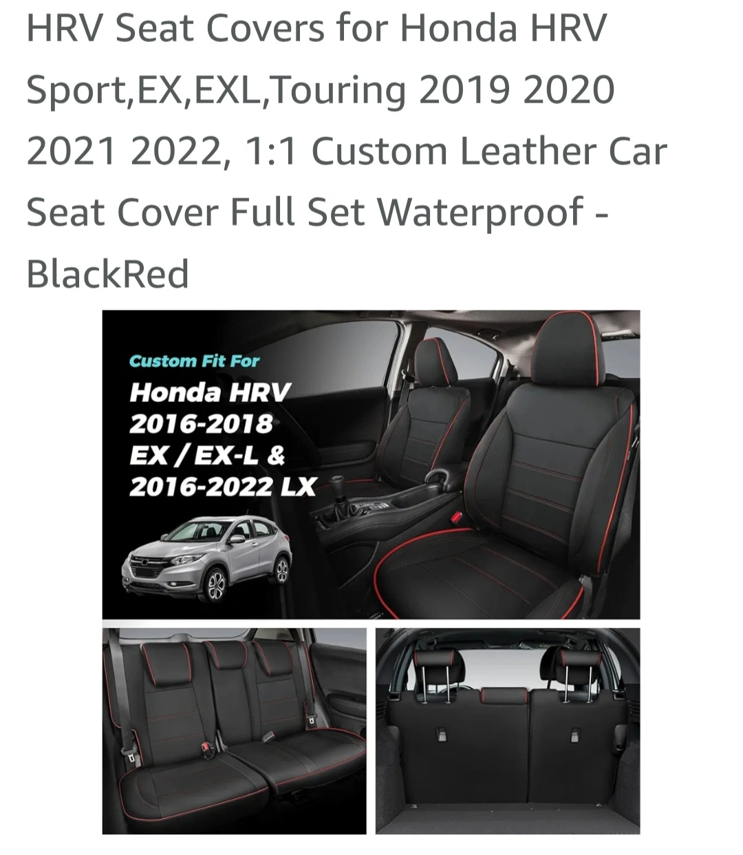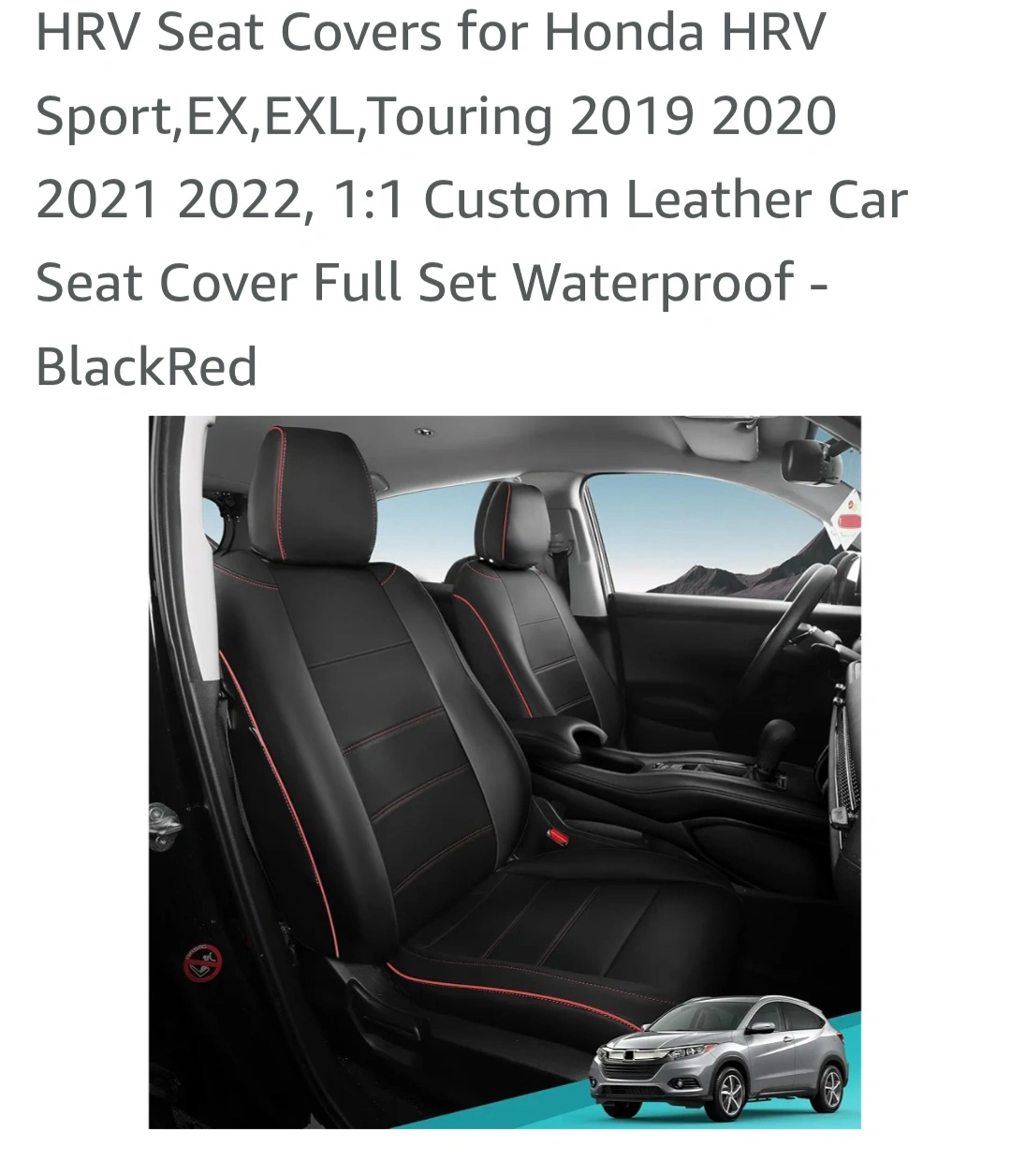 Custom-fit leather seat covers for Honda HRV Sport, EX, EX-L, and Touring models from 2019-2022. Waterproof and includes full set. Features include detachable headrests, storage pockets, and airbag compatibility. Black with red stitching.