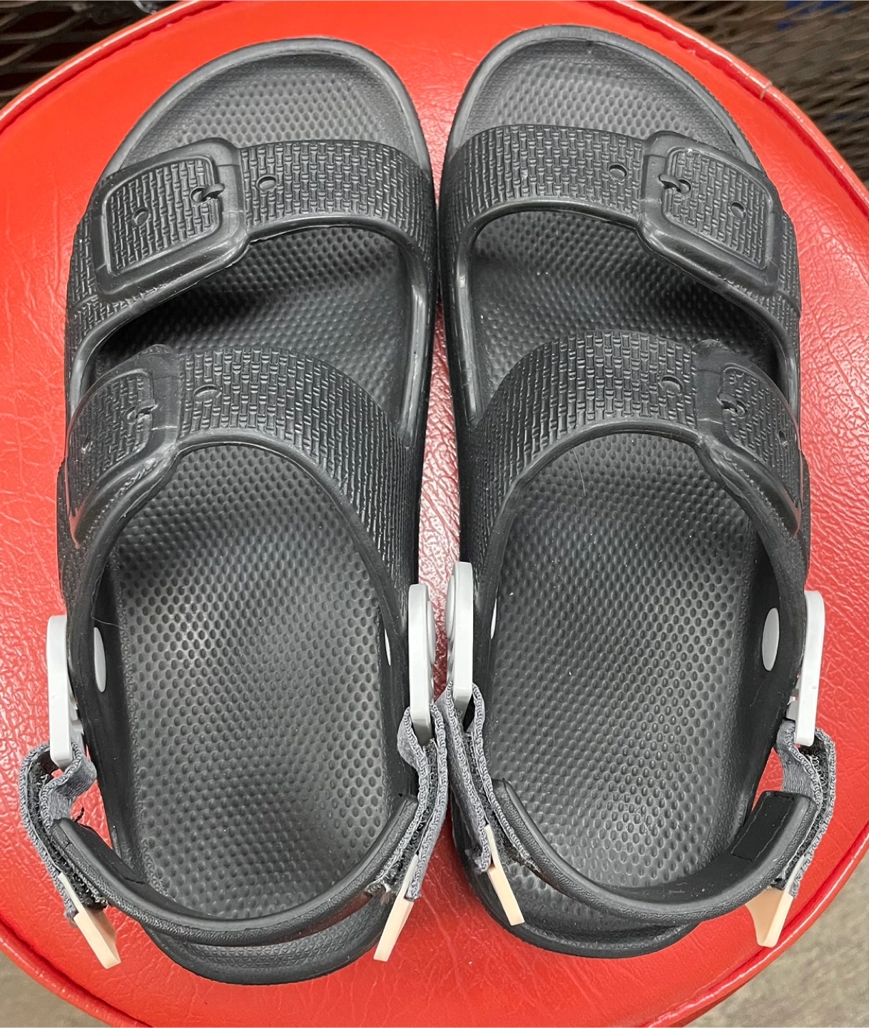 These black sandals are a size 7. They're made of a durable rubber material. The soles have a wavy tread pattern for grip.