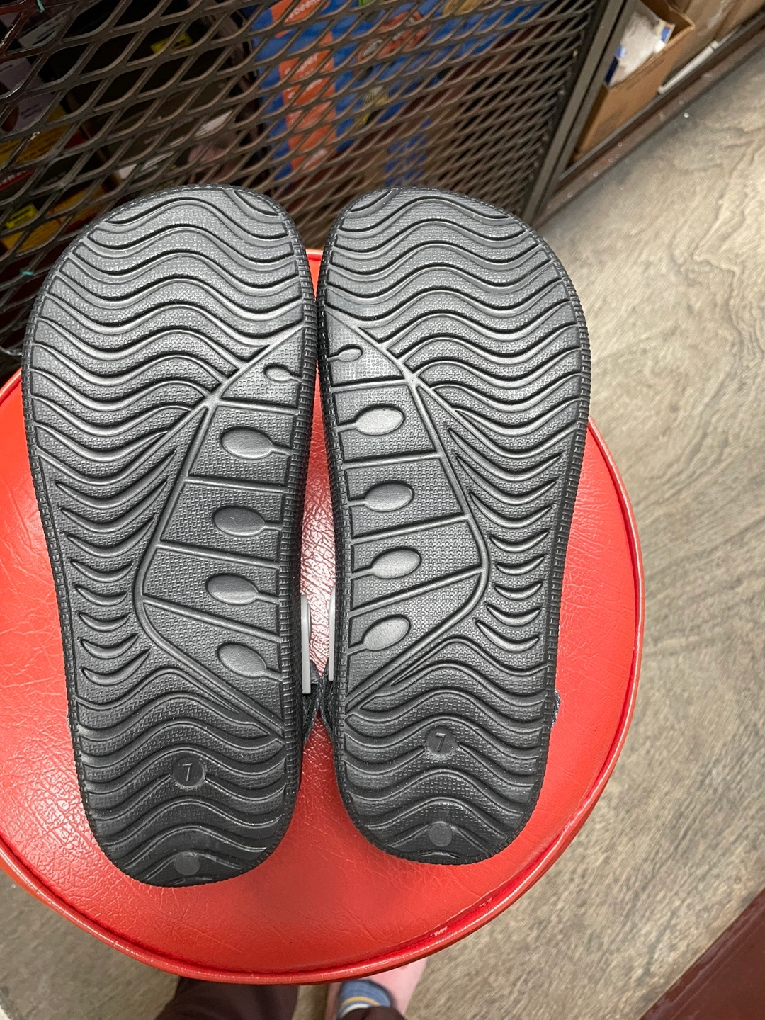 These black sandals are a size 7. They're made of a durable rubber material. The soles have a wavy tread pattern for grip.