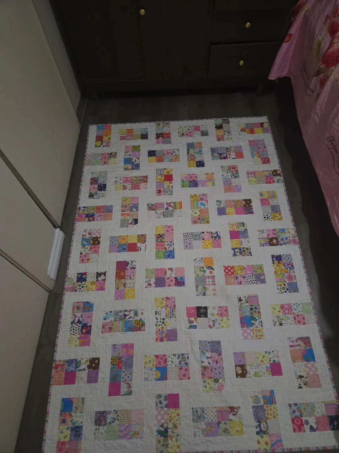 This is a lovely handmade patchwork quilt! It features a white background with many colourful fabric squares sewn together. The edging has a thin rainbow stripe. Perfect for a baby's crib or a decorative throw!