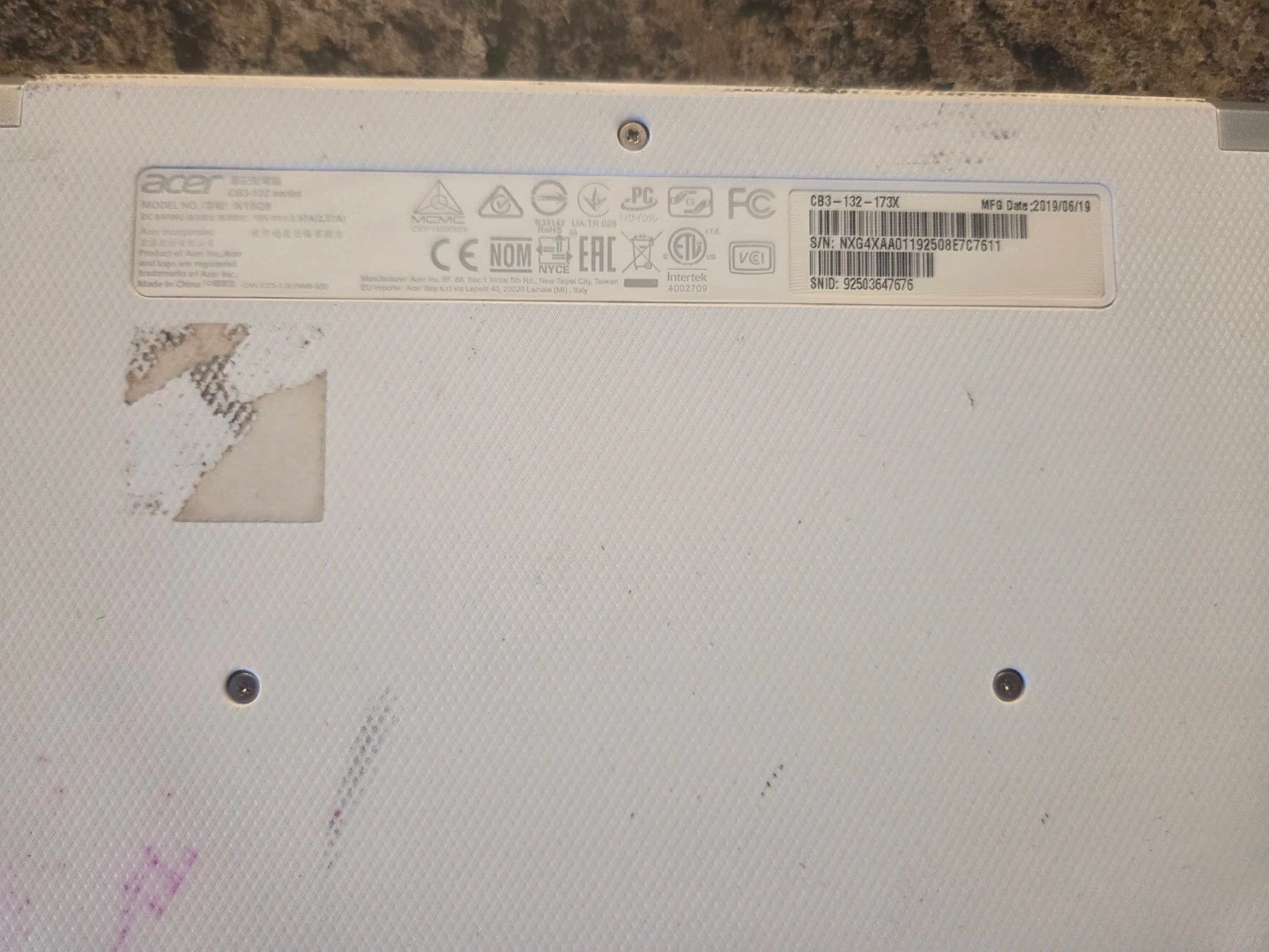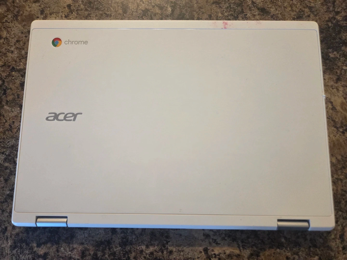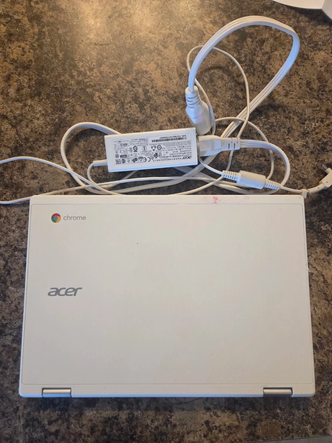 White Acer Chromebook CB3-132 model. It includes the charger and power adapter. The 'G' key cap is missing.