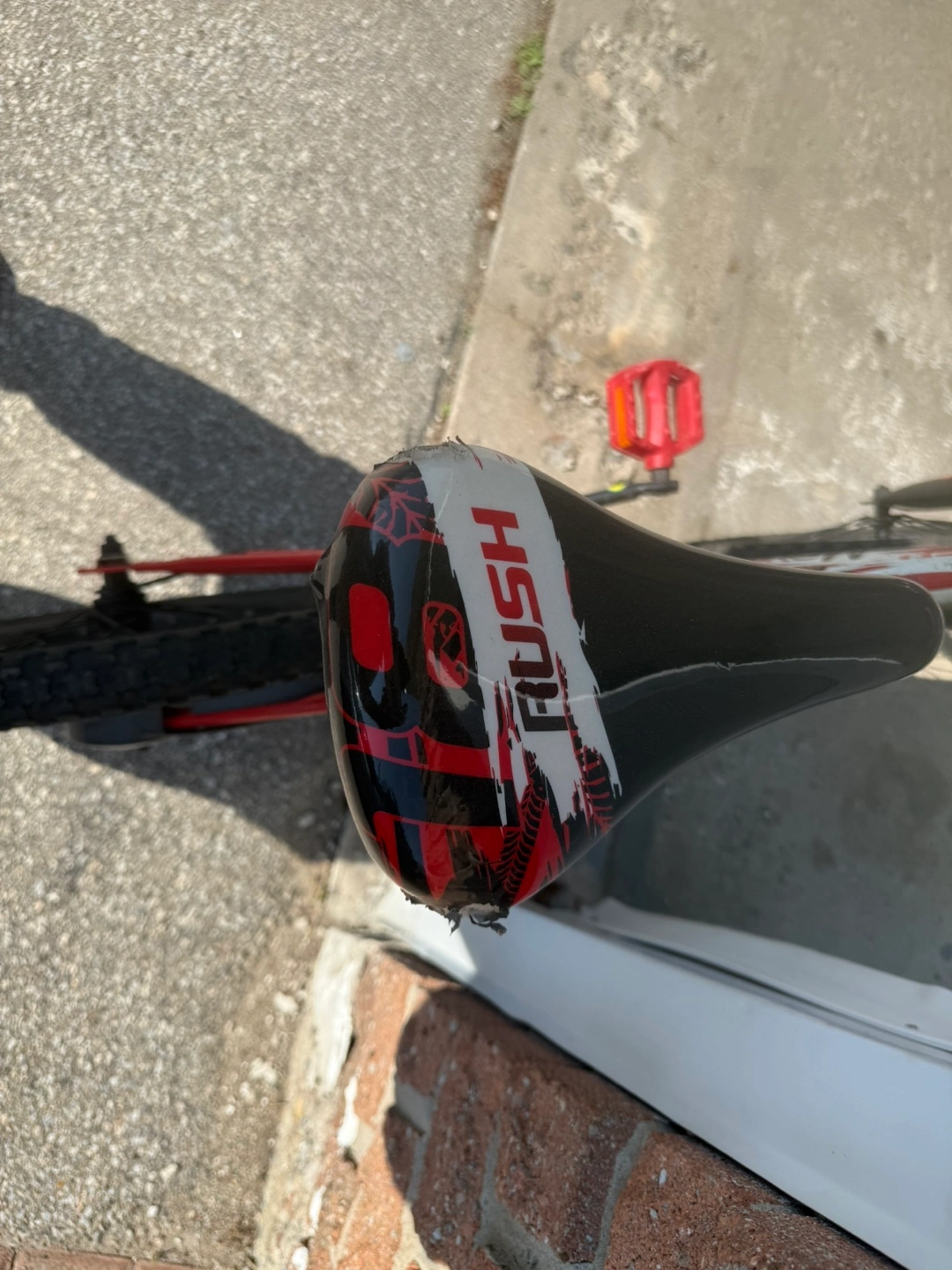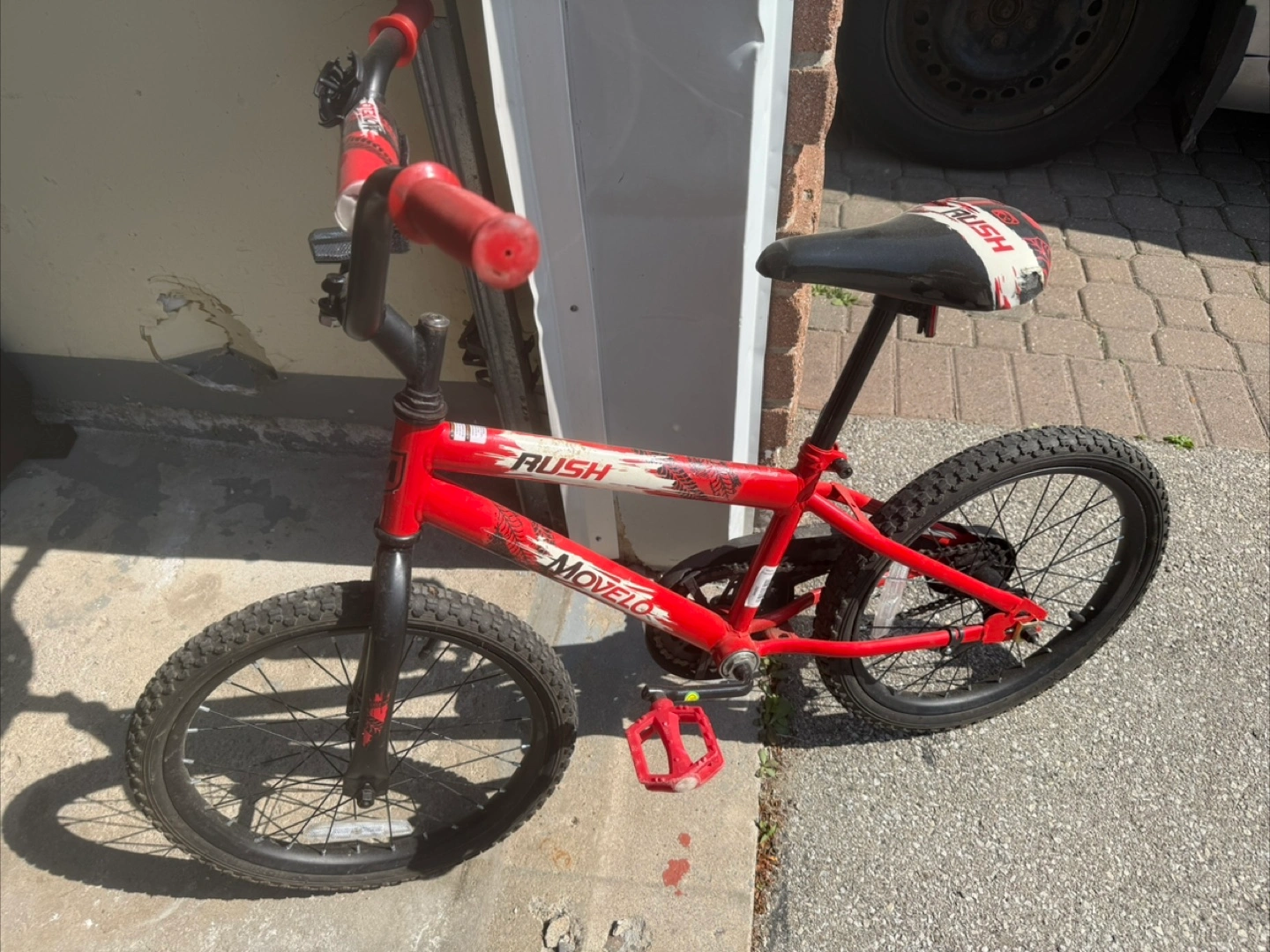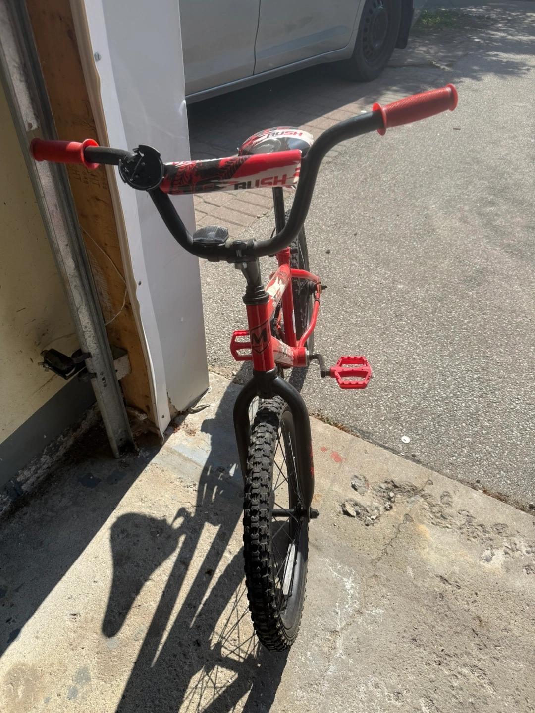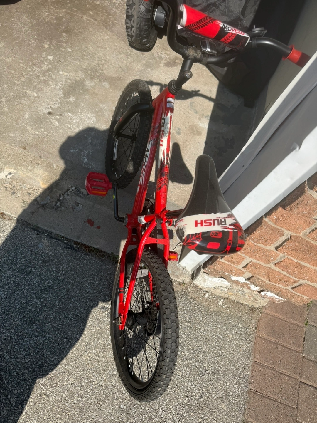 A red BMX bike, 20 inches. perfect for outdoor fun. Featuring black tires, a black seat, and red handlebars and pedals . Small scratches in the seat. Suits for 6 plus years