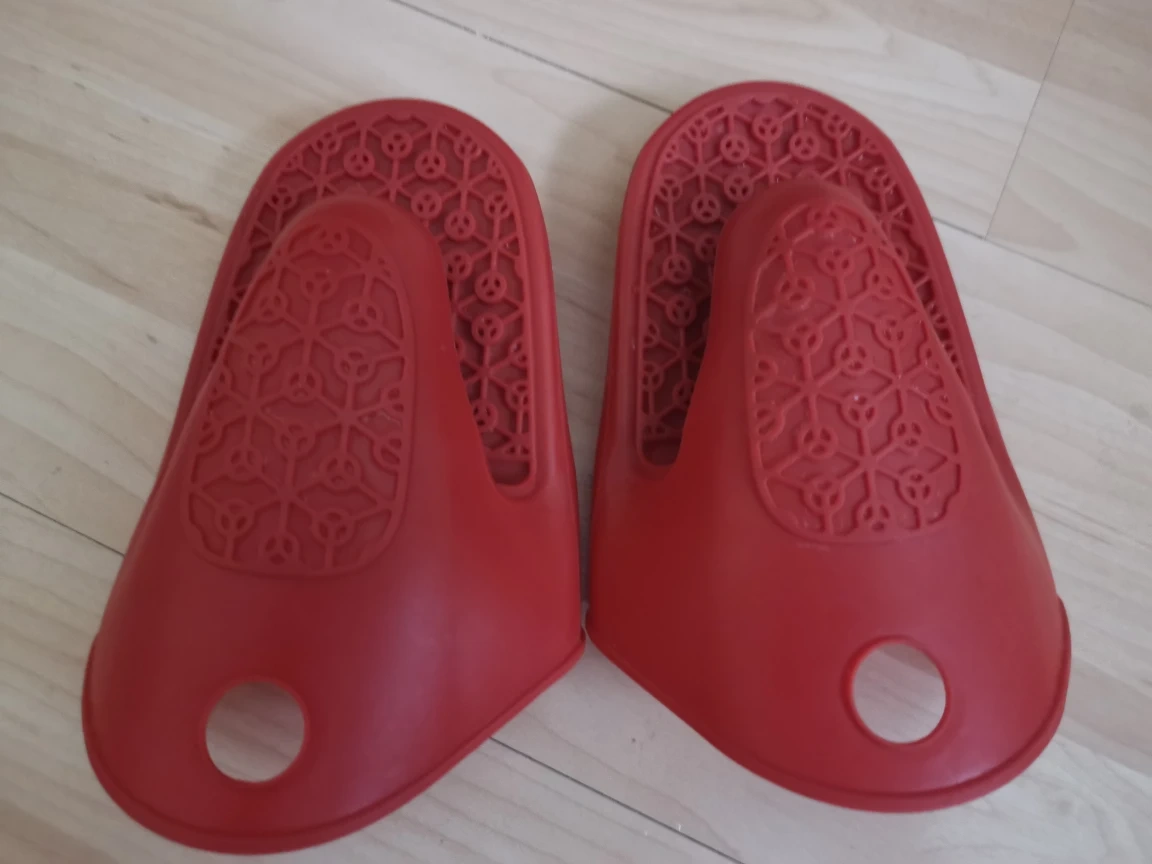 Selling a pair of red silicone oven mitts. They're in great shape and ready to protect your hands from hot pots and pans! The silicone material makes them easy to clean and heat resistant.