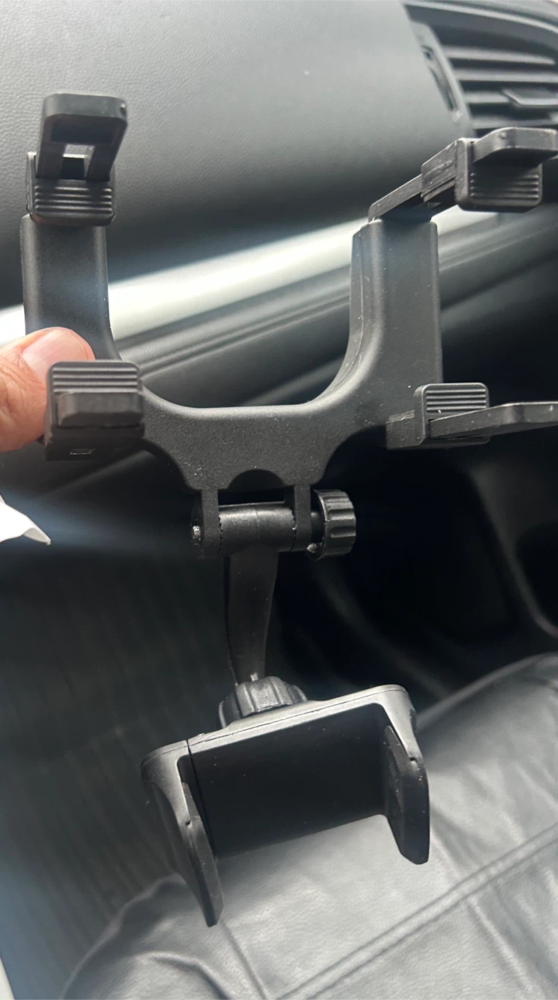 This is a black, adjustable car phone mount. It attaches to your car's rearview mirror. Perfect for hands-free navigation or calls while driving!
