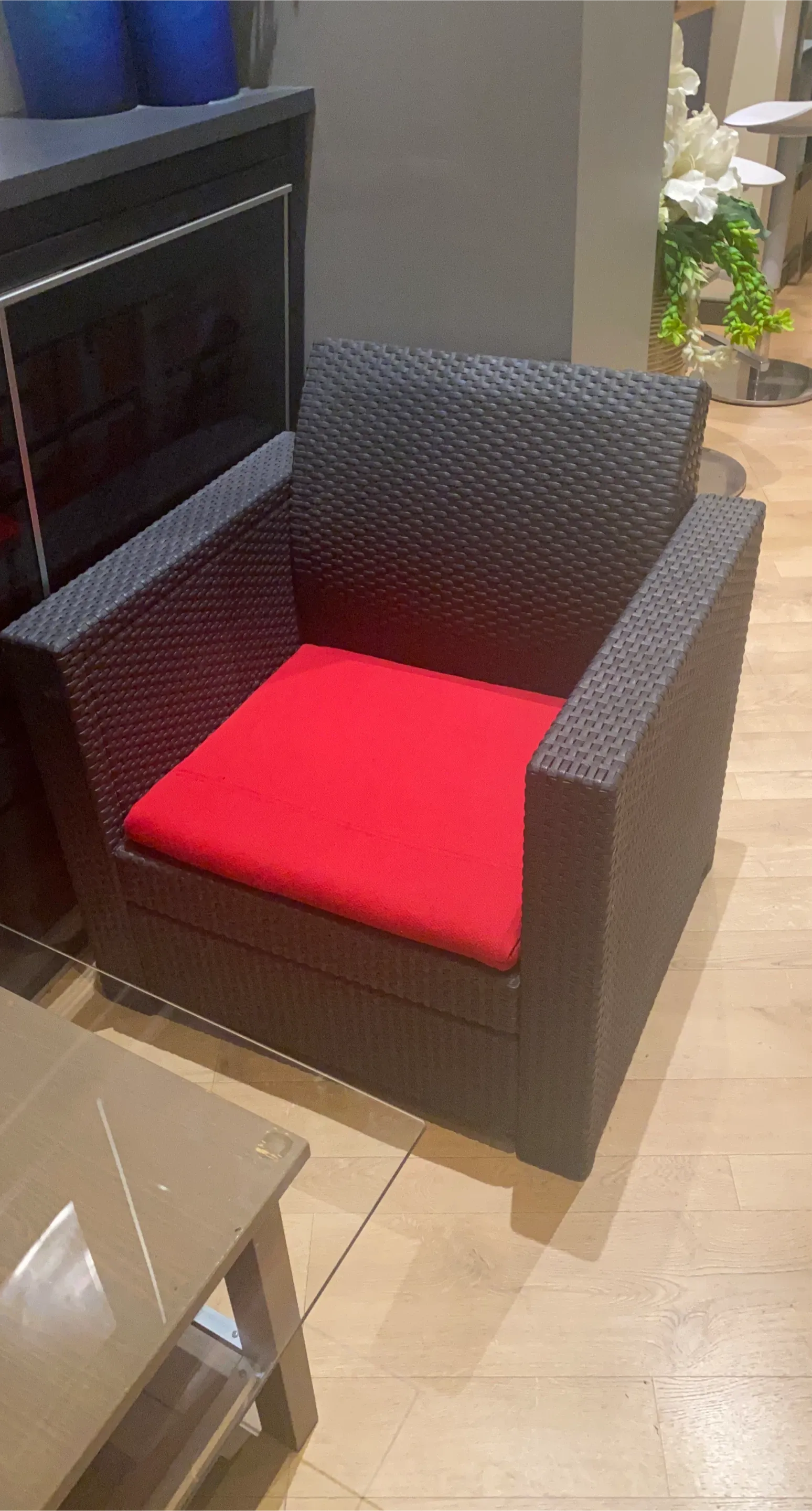 Comfortable wicker patio chair with a bright red cushion! Perfect for relaxing outdoors on your deck or patio.