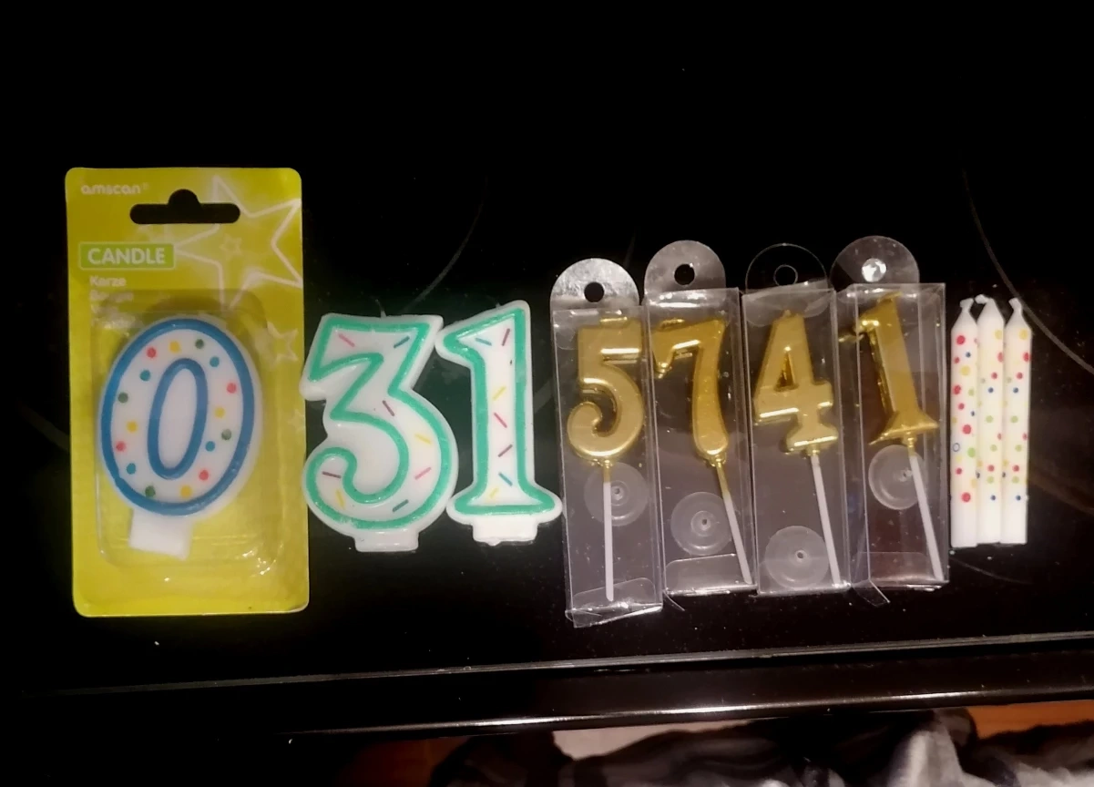Birthday candles in different numbers and colours. Gold numbers include: 5, 7, 4 and 1. Multicoloured candles include: 0, 3 and 1. Also includes 3 smaller multicoloured candles