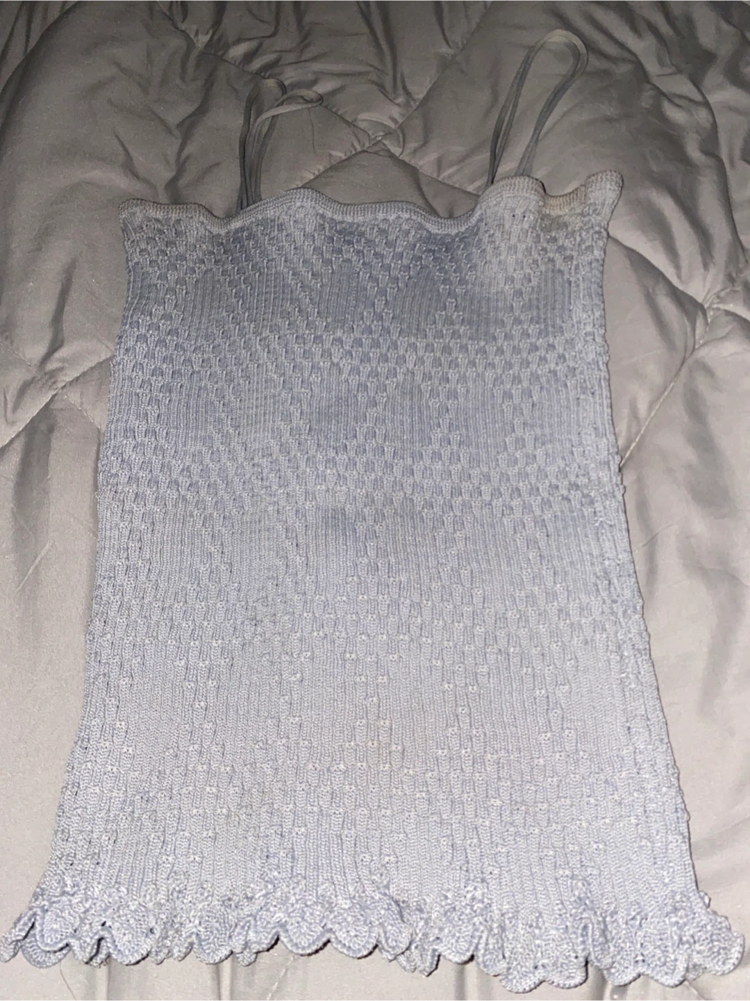This is a Seduction knit tank top. It's light blue with a textured pattern and ruffled hem. Straps are adjustable.