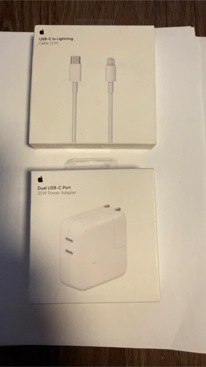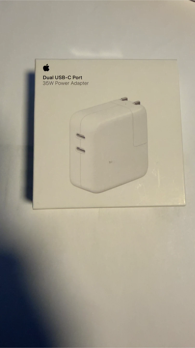Brand new Apple 35W Dual USB-C Port Power Adapter. It's white and includes a 2m USB-C to Lightning cable. Charges multiple devices simultaneously. Perfect for keeping your Apple devices powered up!