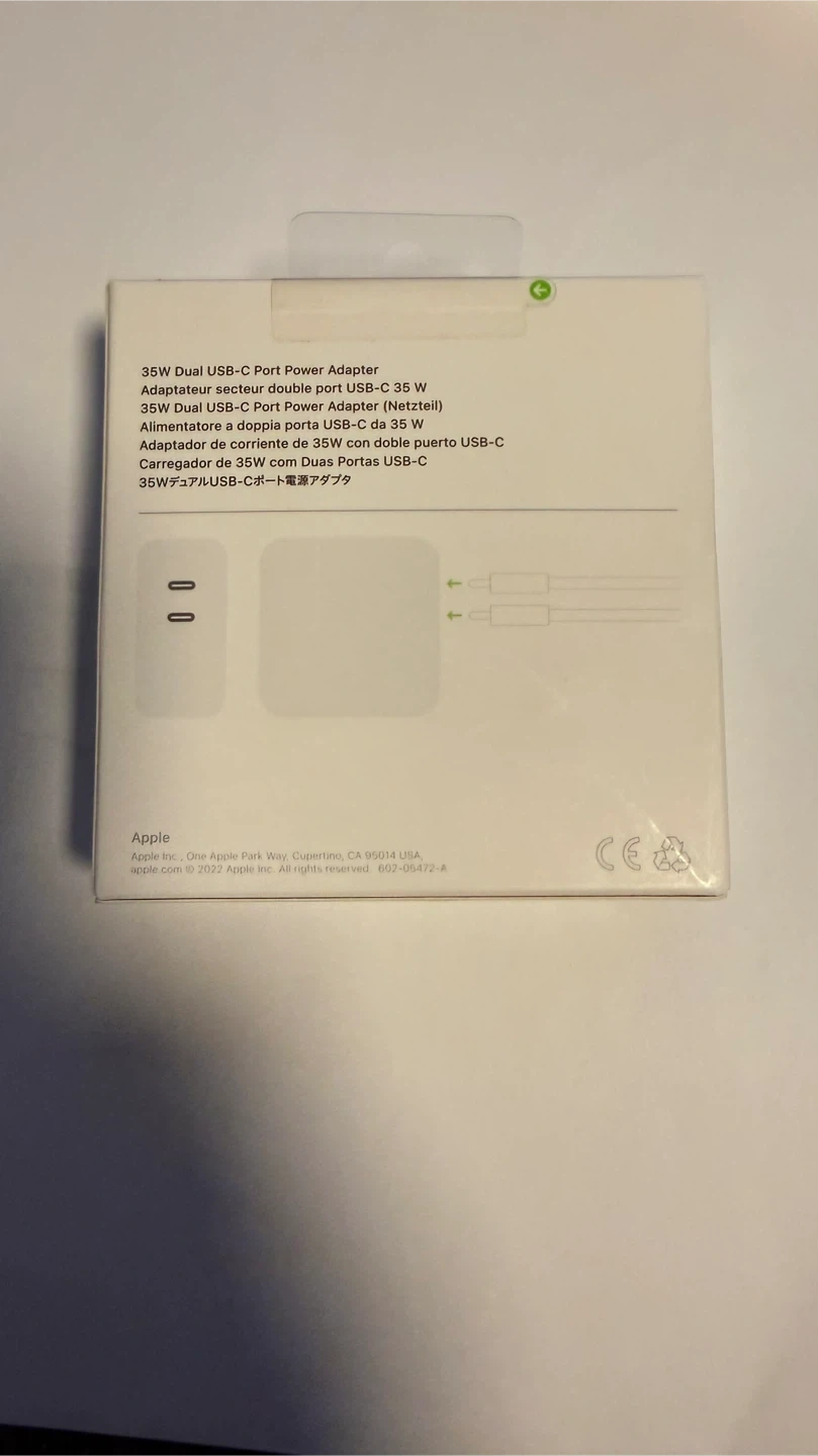 Brand new Apple 35W Dual USB-C Port Power Adapter. It's white and includes a 2m USB-C to Lightning cable. Charges multiple devices simultaneously. Perfect for keeping your Apple devices powered up!