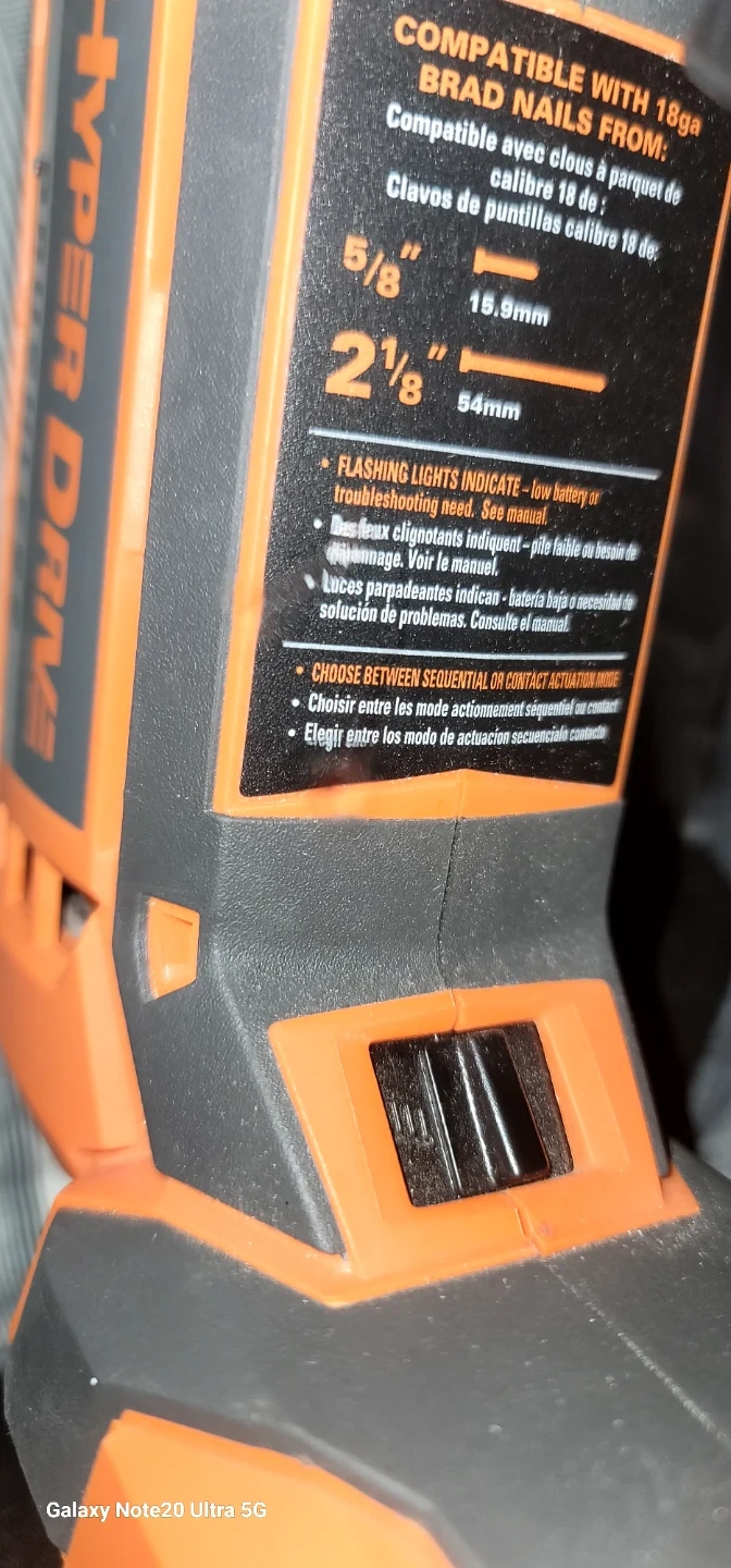 Hello im selling my RIDGID HyperDrive 18 Ga brad nailer. It's compatible with 18 gauge brad nails from 5/8" to 2-1/8" long. The tool features brushless technology for efficient operation. It can be set to sequential or contact actuation modes.