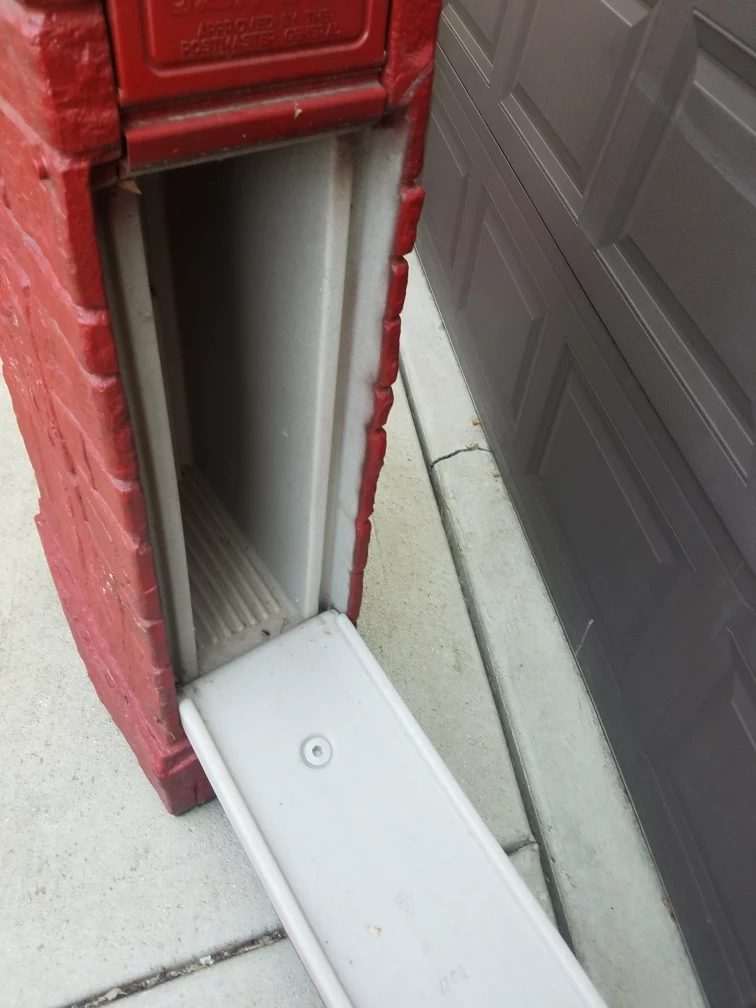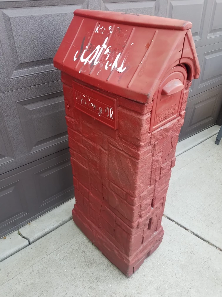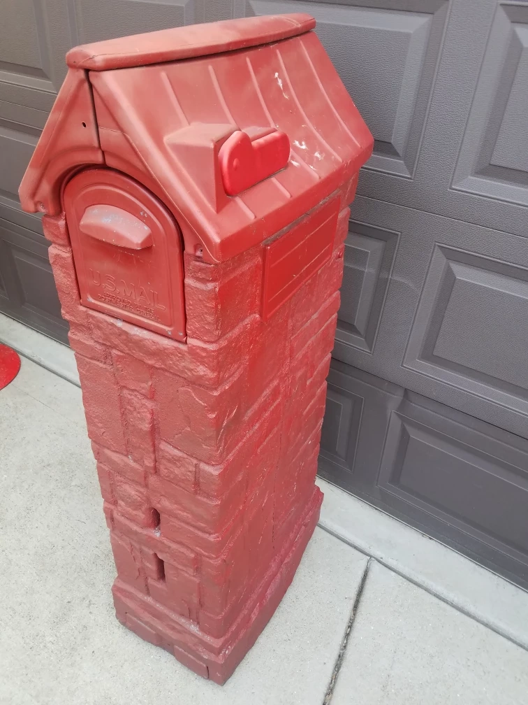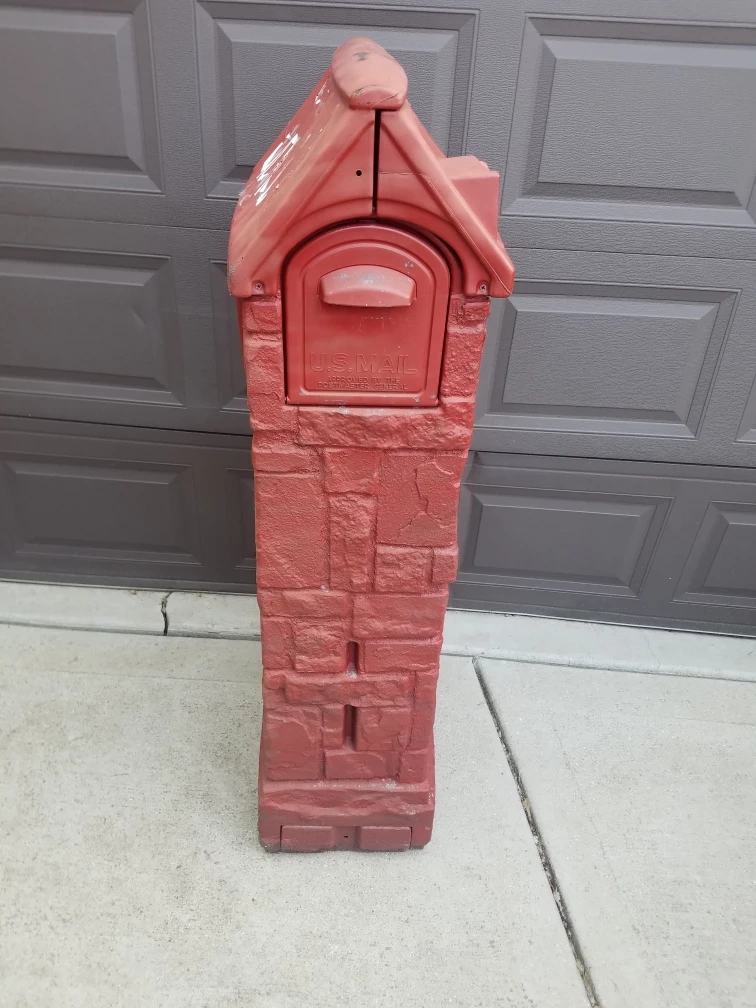 This mailbox has a brick-style design and a red finish. There's a slot for mail and an access door. It features a small roof for protection. Using this mailbox could bring a sense of peace to your day.