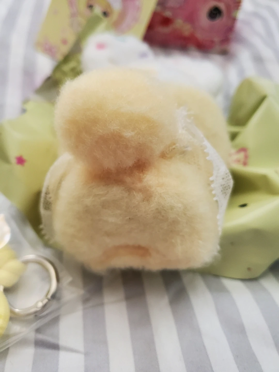 Not responsible for any manufacturer defects. Small marks on foot and next to foot. Small mark on yellow ribbon.