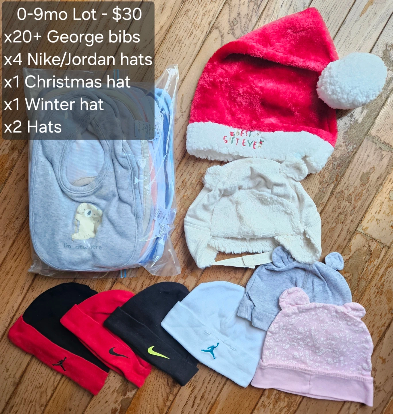 This lot includes over 20 George brand bibs for babies aged 0-9 months. It also comes with 7 assorted hats, including 4 Nike/Jordan hats, 1 Christmas hat, 1 winter hat, and an additional hat. The bibs feature cute designs, and the hats offer a variety of styles for your little one. Perfect for keeping your baby cozy and clean!
