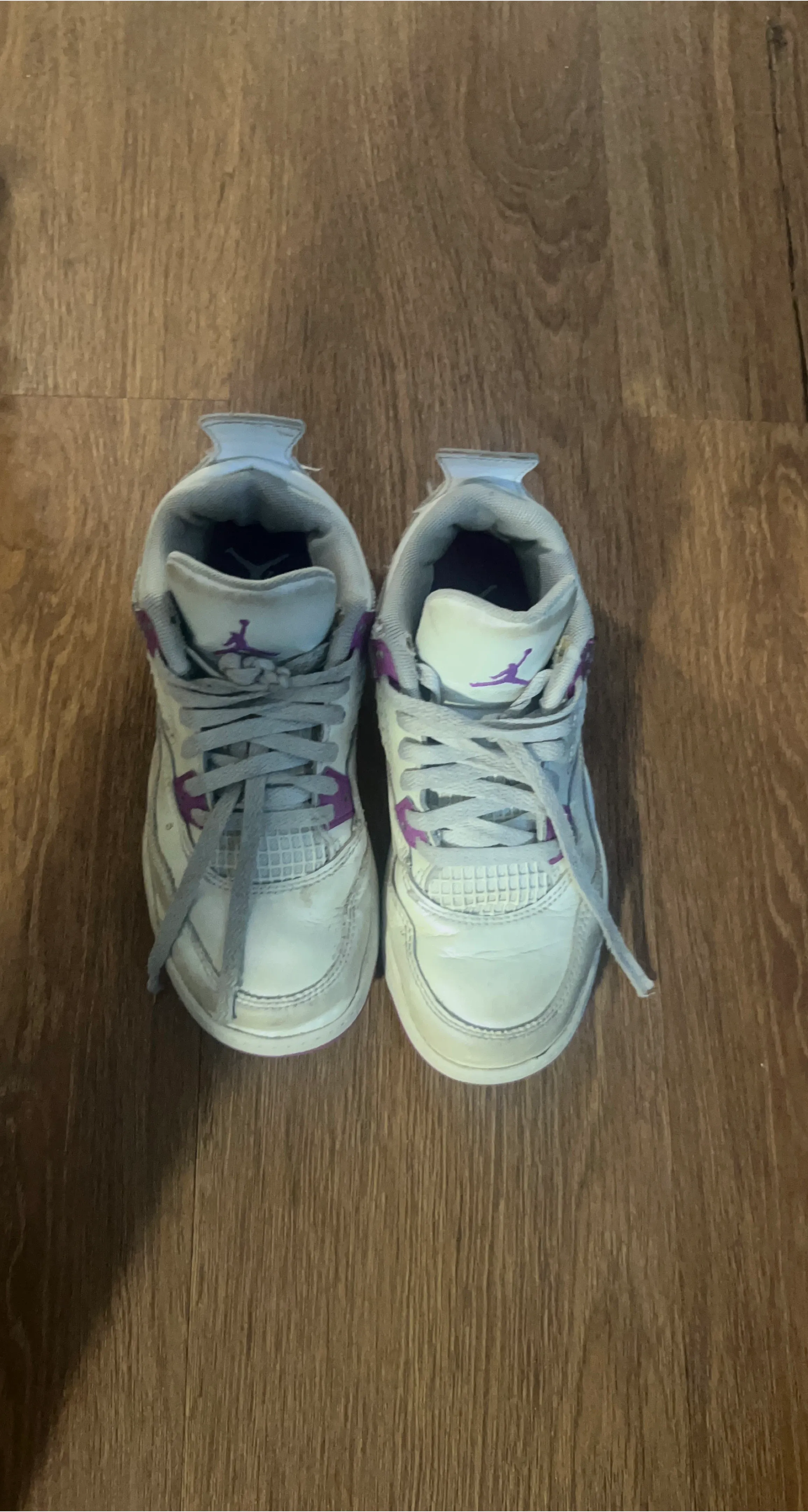Toddler Air Jordan 4 Retro sneakers in white with purple accents. They're pre-owned and ready for a new owner. Leather and synthetic materials.