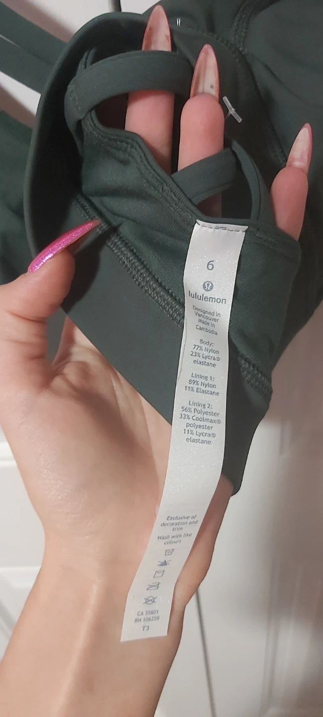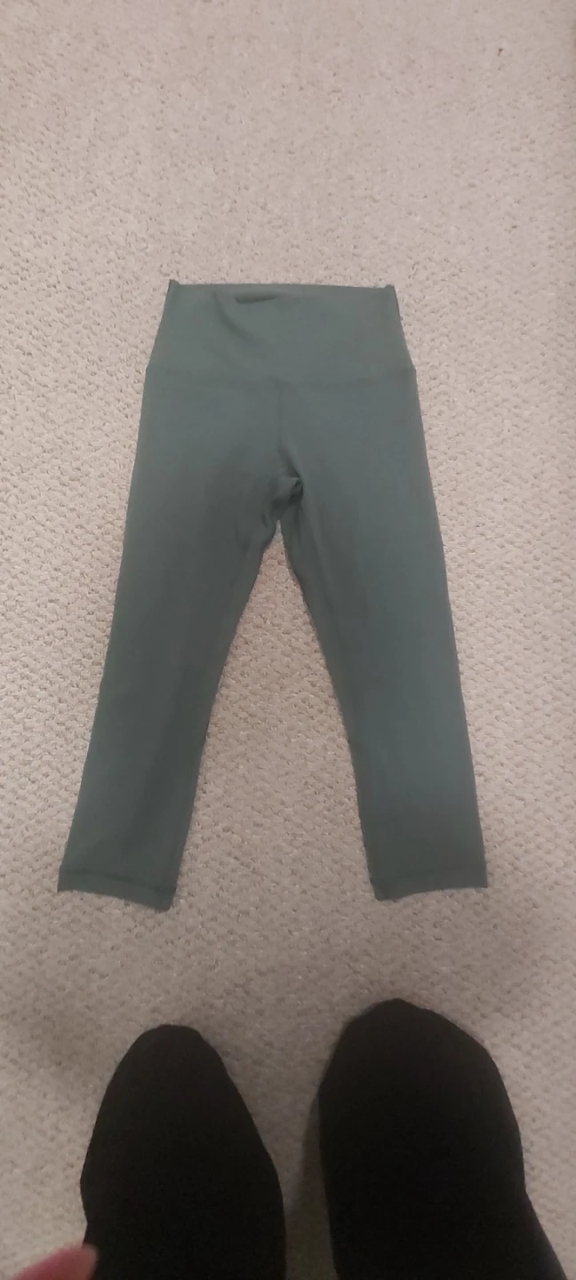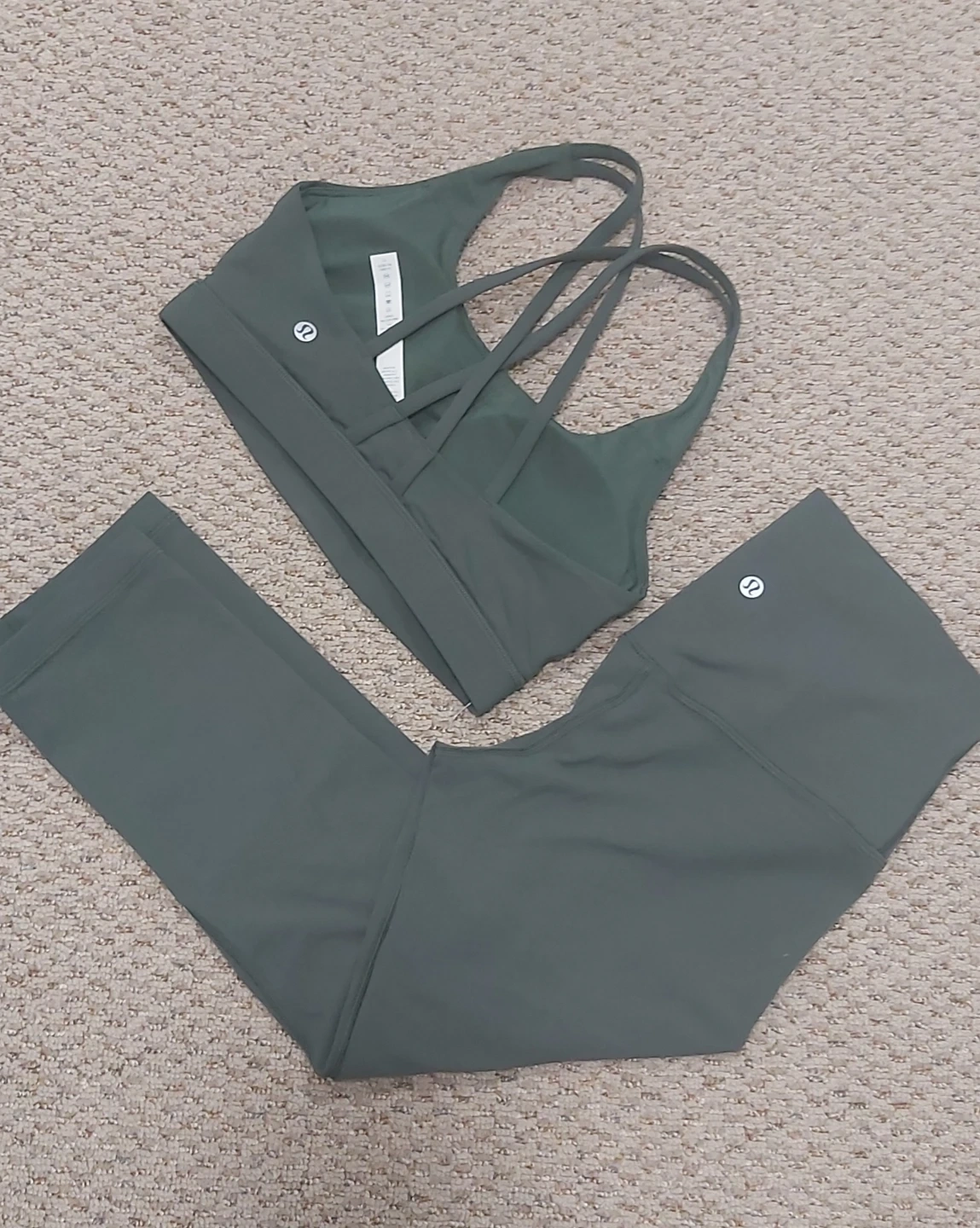 Lululemon Align cropped leggings and sports bra set. Both items are size 6 and dark green. The leggings are made with a Nylon and Elastane blend, while the bra features a Nylon, Polyester, and Elastane blend. Perfect for workouts or casual wear!