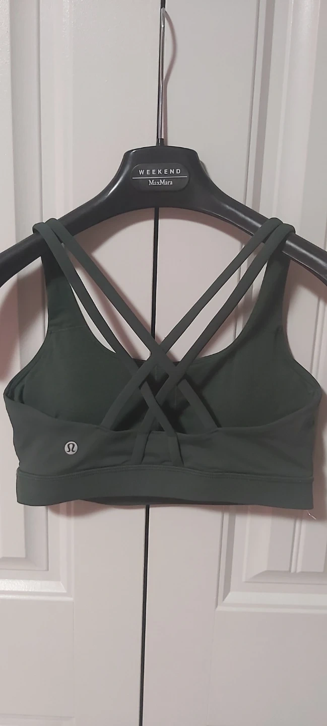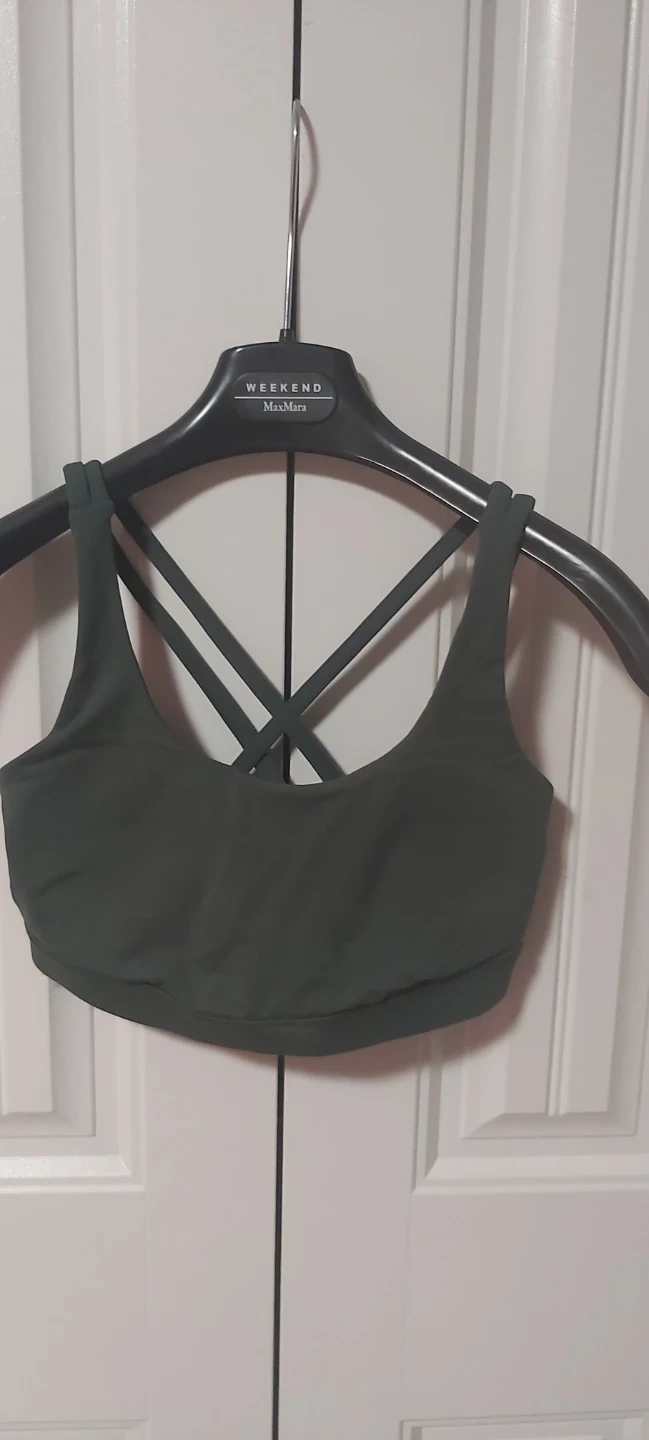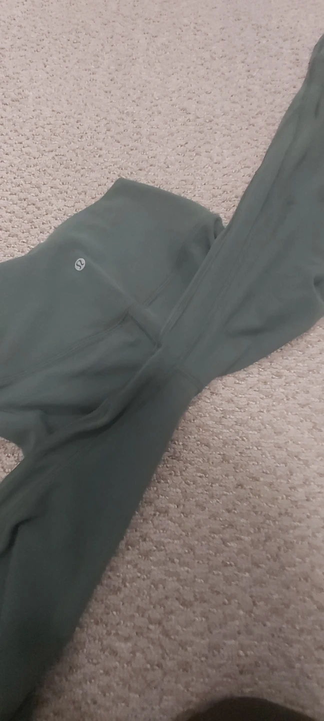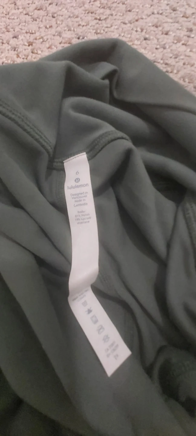 Lululemon Align cropped leggings and sports bra set. Both items are size 6 and dark green. The leggings are made with a Nylon and Elastane blend, while the bra features a Nylon, Polyester, and Elastane blend. Perfect for workouts or casual wear!