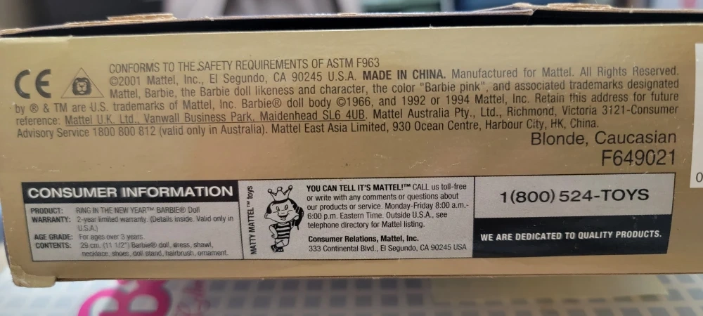 Selling a brand new, in-box Ring in the New Year Barbie Doll! This beautiful doll comes with a dress, shawl, necklace, shoes, doll stand, hairbrush, and ornament. The doll is blonde and Caucasian. It's still in the original packaging and ready for a new home! This is a 2001 barbie