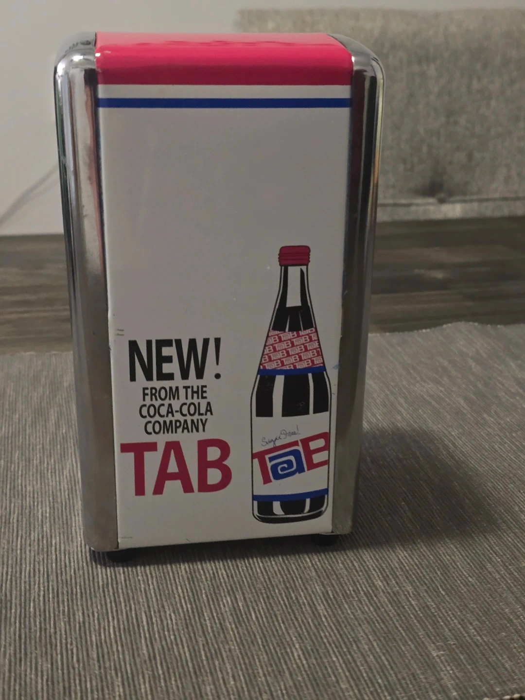 This is a TAB Cola branded napkin holder. It's made of metal with a vibrant red and blue design featuring a TAB Cola bottle. Perfect for adding a retro touch to your kitchen or bar!