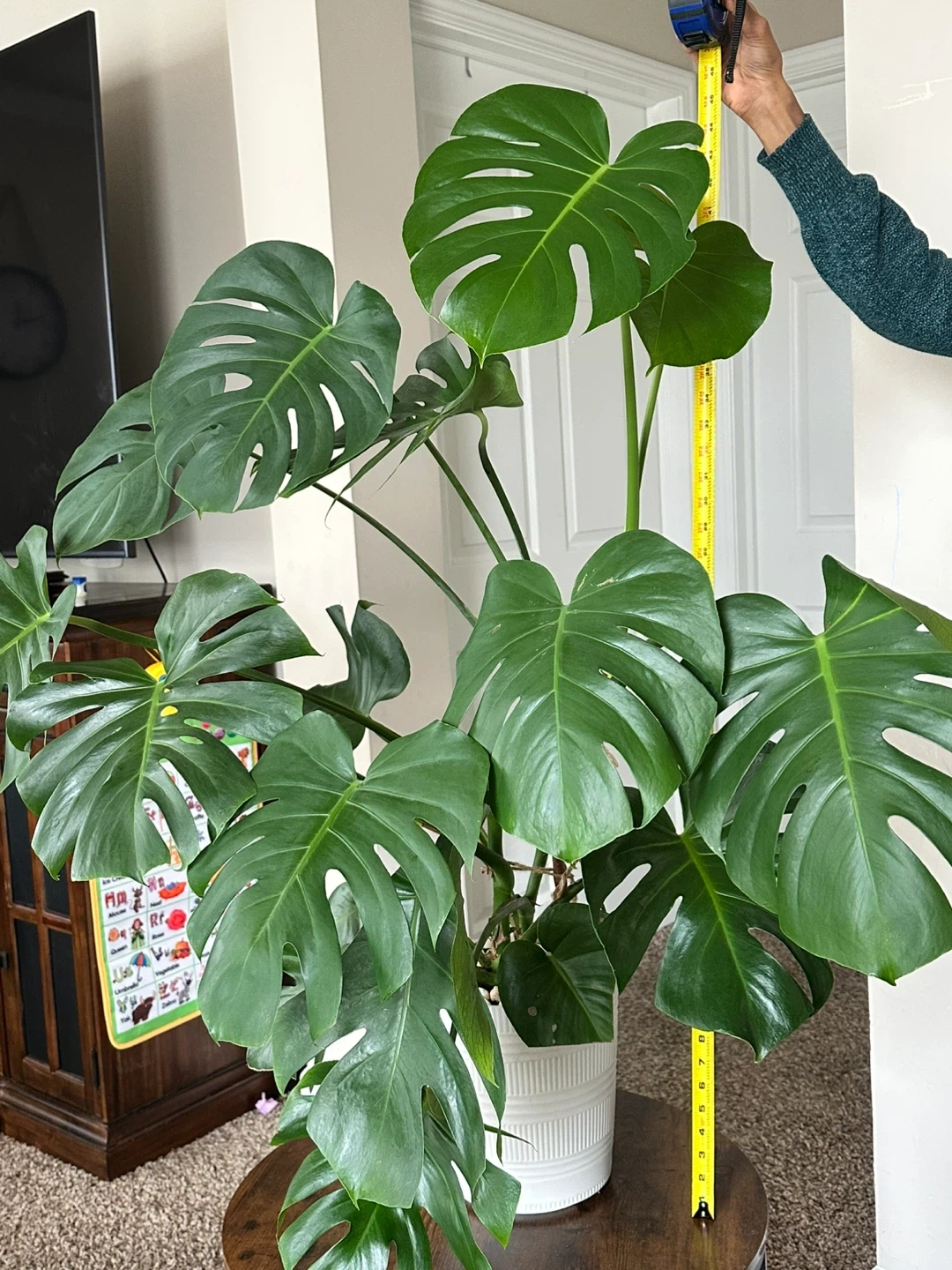 This is a large, established Monstera Deliciosa houseplant. It's in a white decorative pot. The plant stands approximately 4 feet tall. It's a beautiful statement piece for any room!