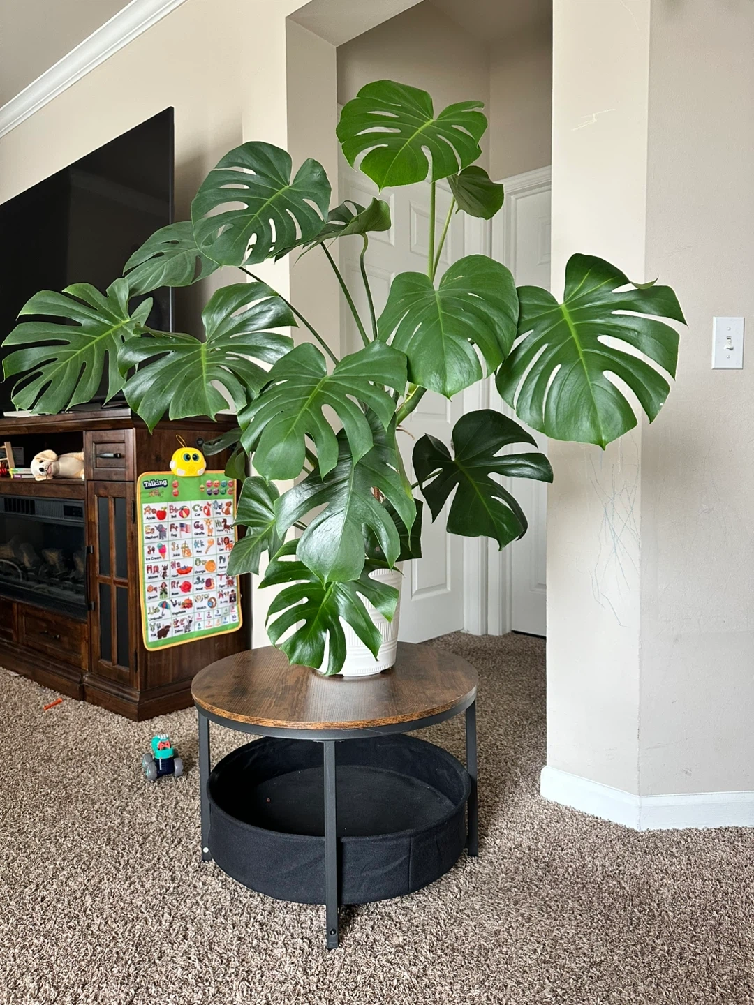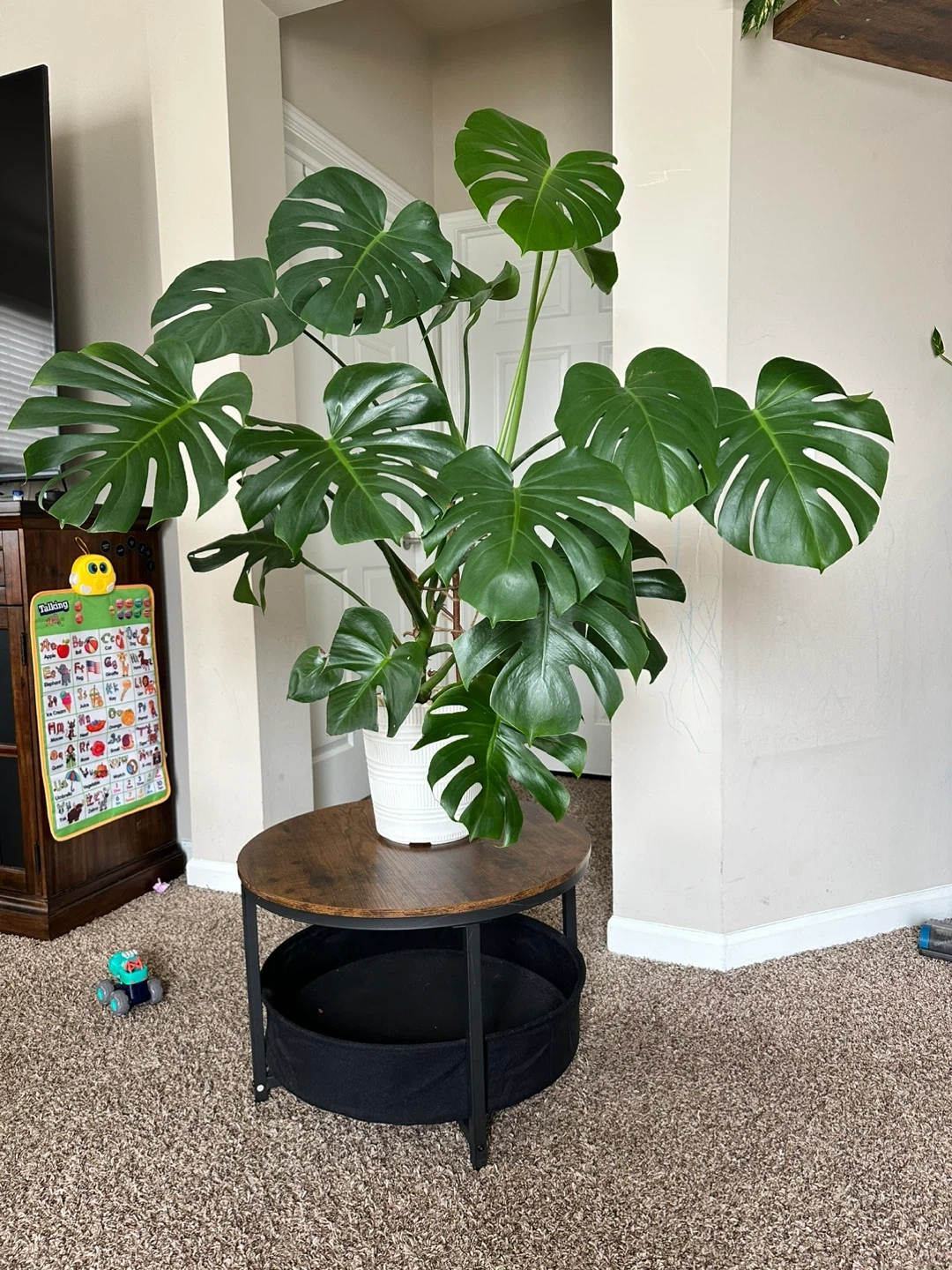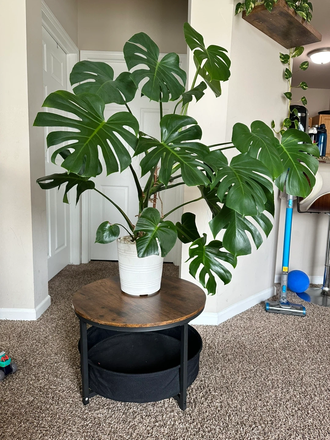 This is a large, established Monstera Deliciosa houseplant. It's in a white decorative pot. The plant stands approximately 4 feet tall. It's a beautiful statement piece for any room!