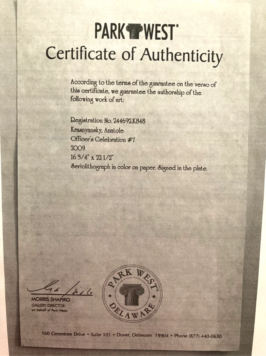 Selling a framed seriolithograph in colour on rice paper by Krasnyansky, titled Officer's Celebration #7. This piece is from Park West Gallery and comes with a Certificate of Authenticity. The dimensions are 16 3/4" x 22 1/2". Excellent condition no damage on the frame.