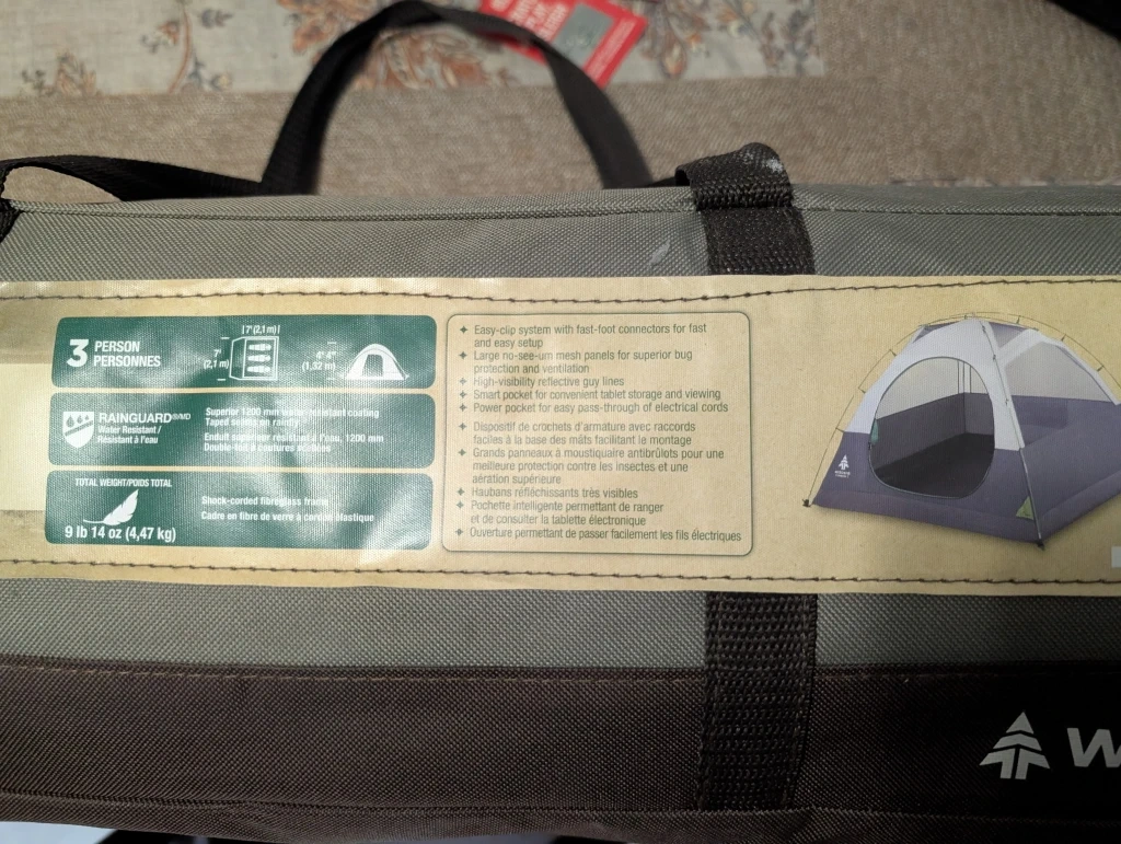 This is a 3-person tent with RAINGUARD water-resistant coating and taped seams. It features a shock-corded fiberglass frame and measures 7' x 7' (2.1m x 2.1m) with a 4' 4" (1.32m) height. It's designed for easy setup with fast-foot connectors.