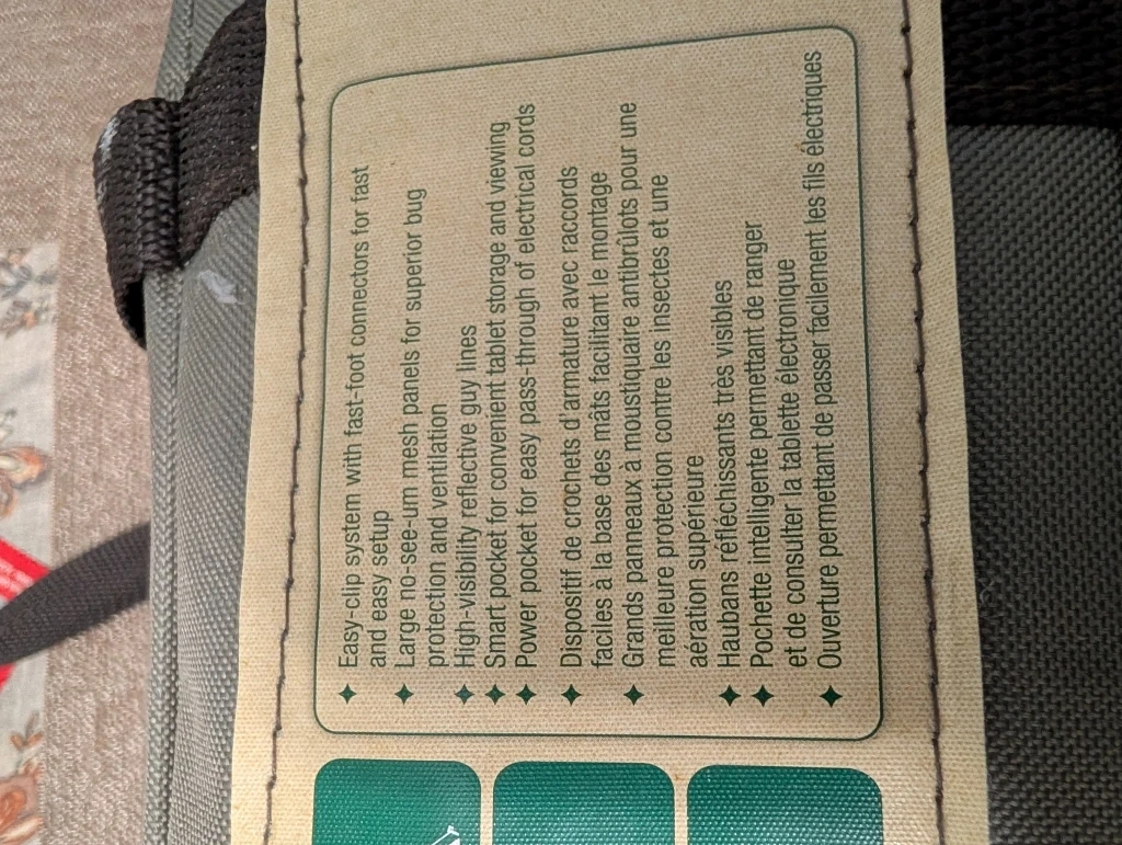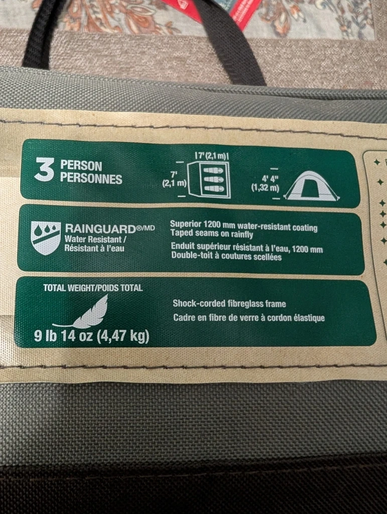 This is a 3-person tent with RAINGUARD water-resistant coating and taped seams. It features a shock-corded fiberglass frame and measures 7' x 7' (2.1m x 2.1m) with a 4' 4" (1.32m) height. It's designed for easy setup with fast-foot connectors.