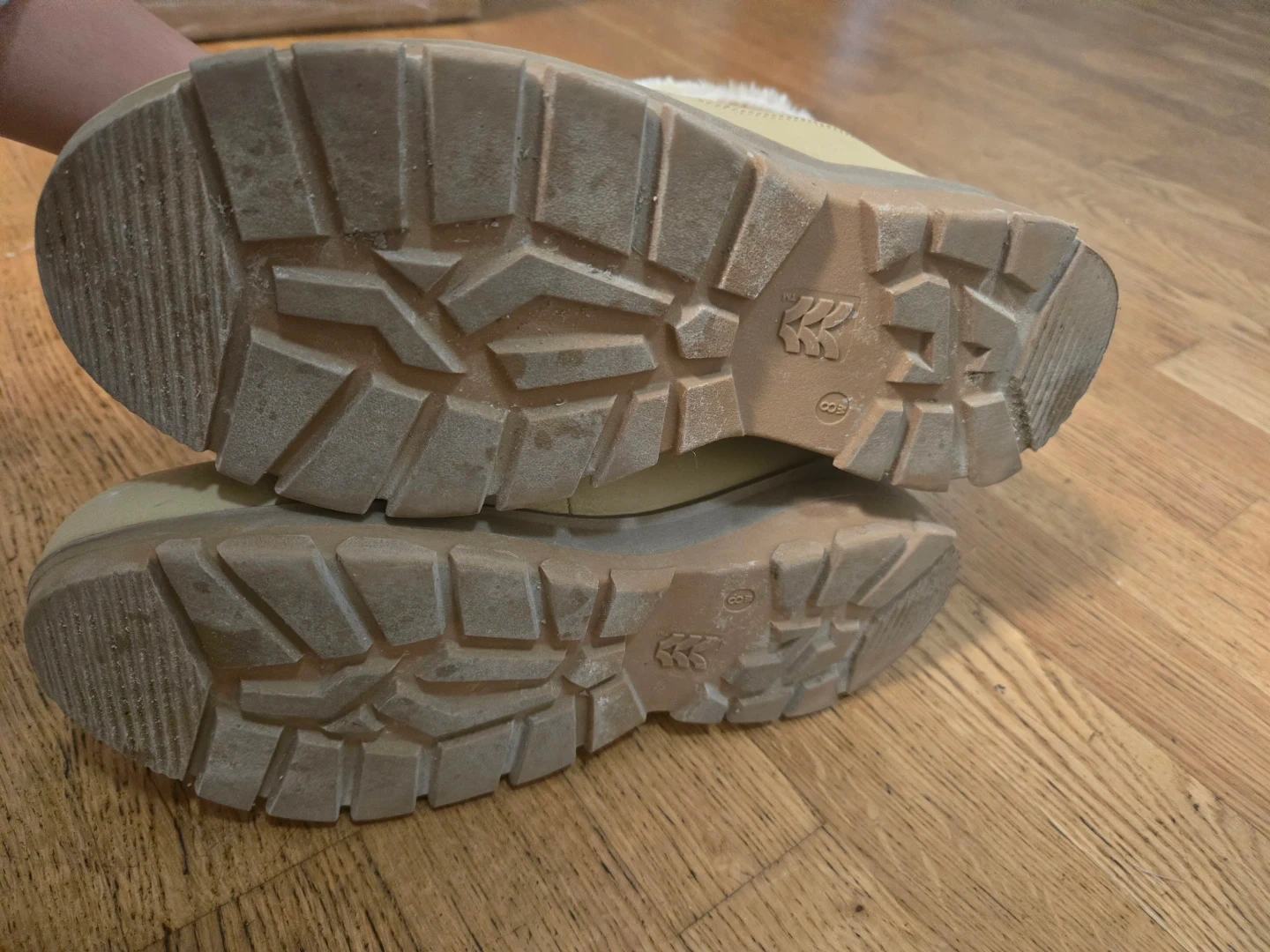 These tan winter boots are designed for warmth and comfort. They feature a faux fur lining and a durable sole for traction. Size is 8W.
