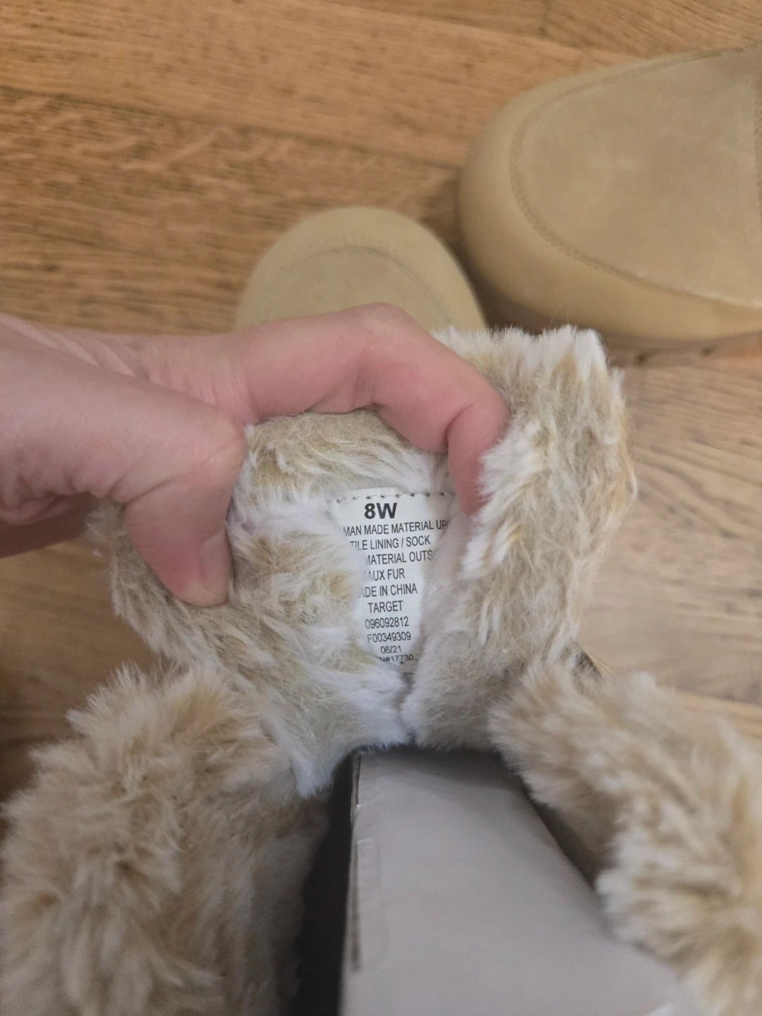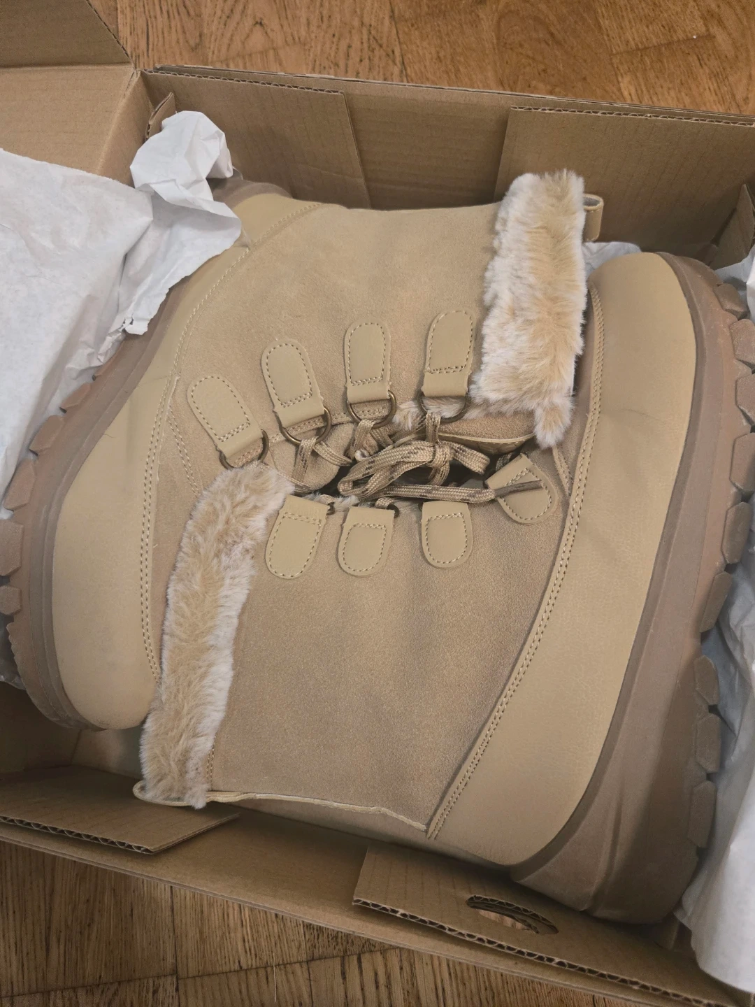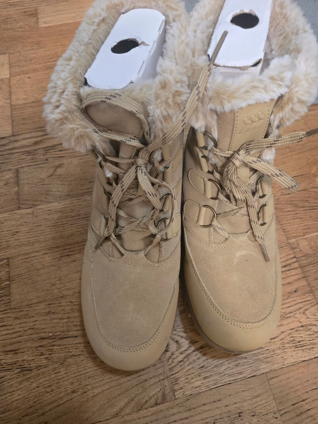 These tan winter boots are designed for warmth and comfort. They feature a faux fur lining and a durable sole for traction. Size is 8W.