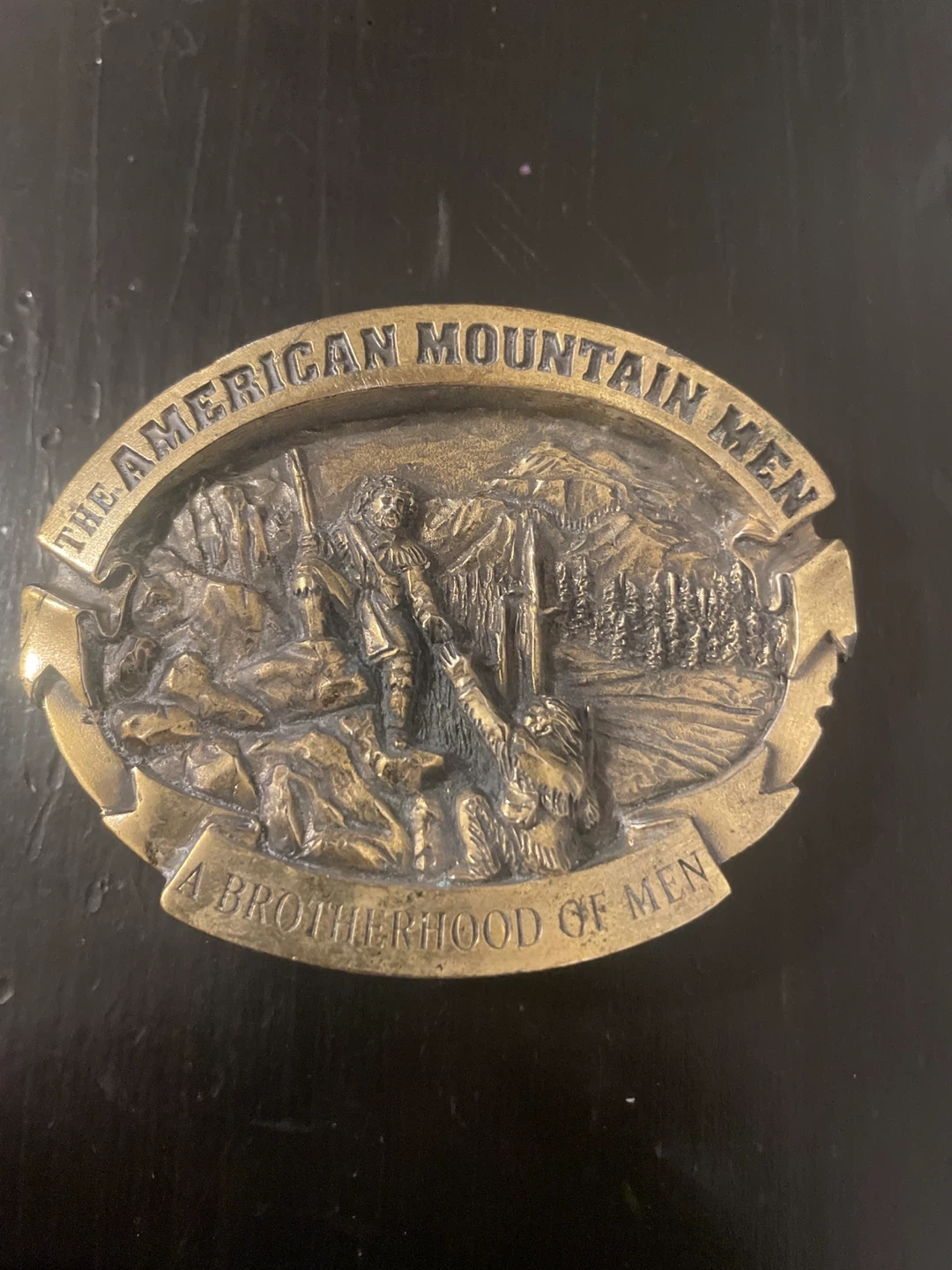 This vintage belt buckle features "The American Mountain Men, A Brotherhood of Men" inscribed on it. It's made of metal with a detailed relief of mountain men in a rugged landscape. It has a standard belt loop and clasp on the back.