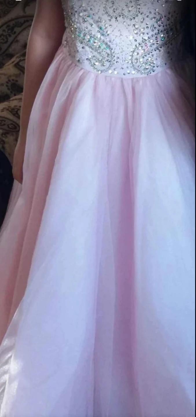 Beautiful pink Cinderella Couture gown with intricate beadwork on the bodice and a full tulle skirt. Features a lace-up back for an adjustable fit. Size 16 girls, Perfect condition worn a few hours