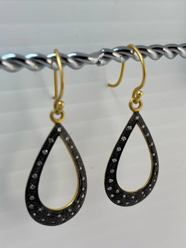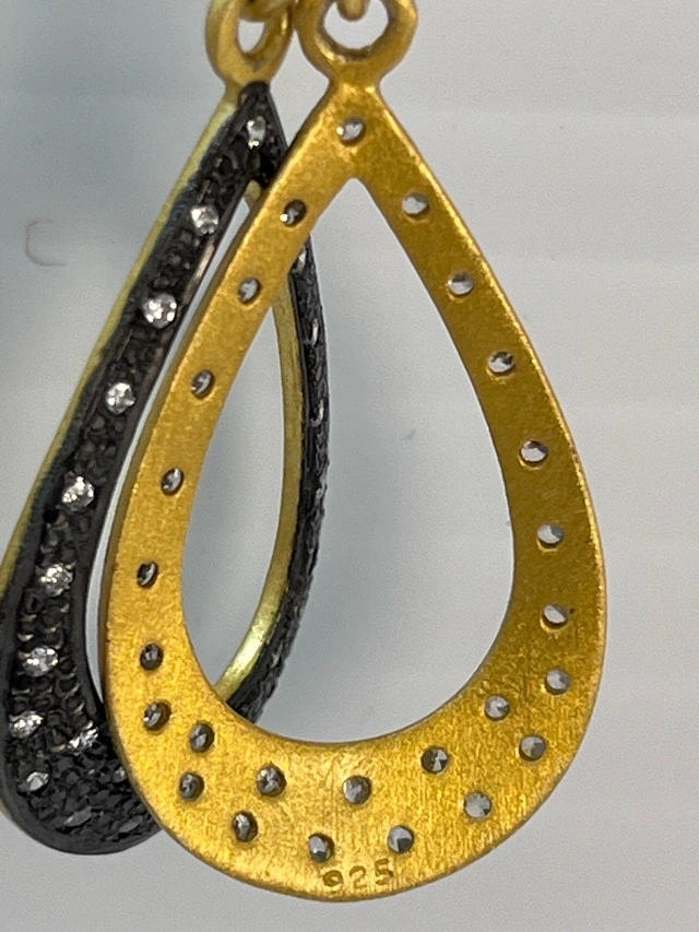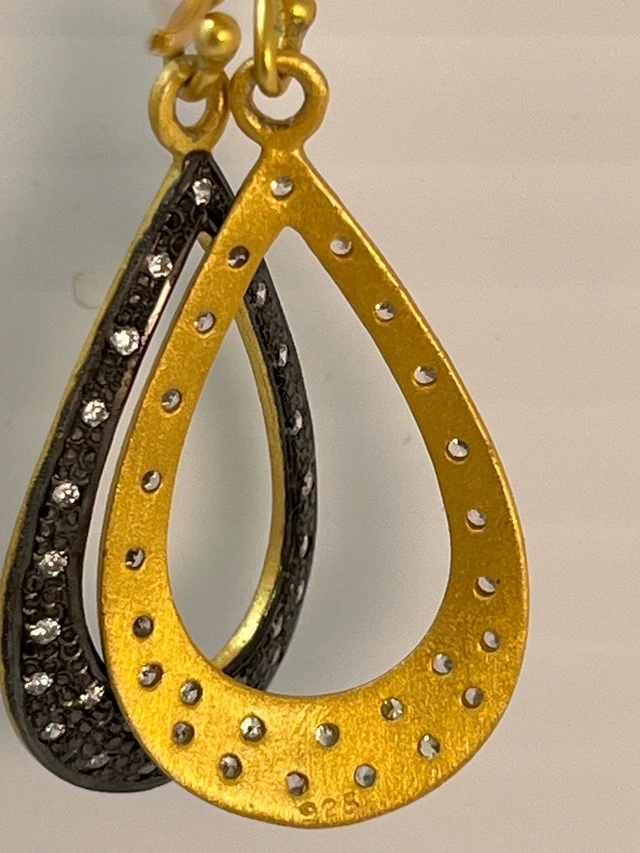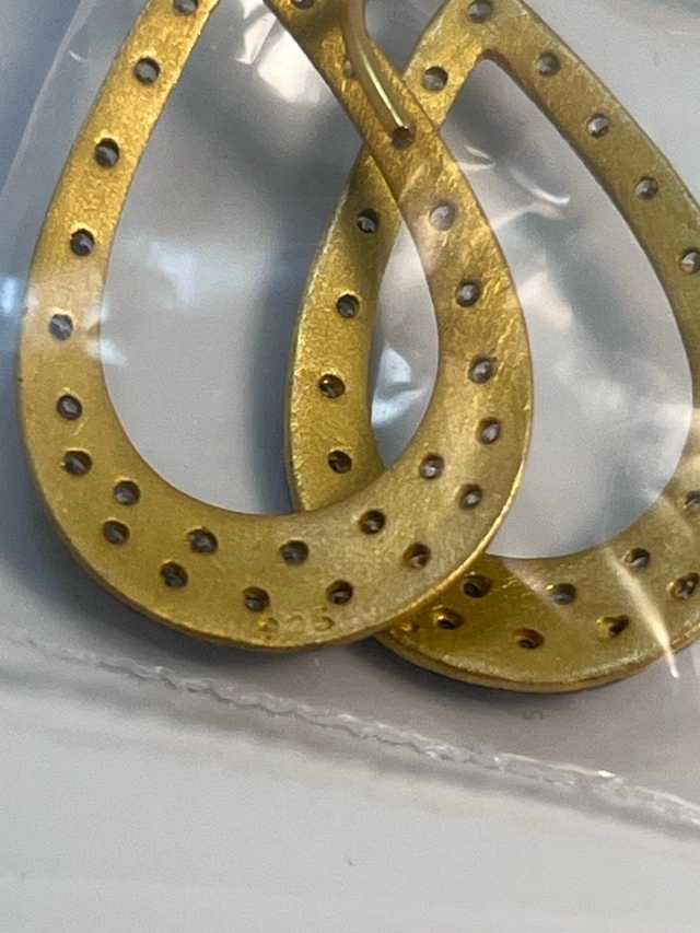 These are lovely 925 silver 24 K gold bonded earrings with cubic zirconia stones. They are in excellent New condition. Metal: 925 Sterling Silver with 24 K gold bond. Stone: Cubic Zirconia. Style: Drop/Dangle. These earrings are ready to add a touch of elegance to any outfit! Pick up only! If the ad is still up, the earrings are available!