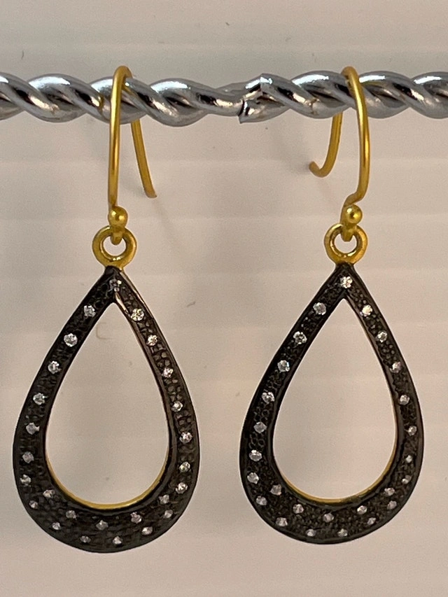 These are lovely 925 silver 24 K gold bonded earrings with cubic zirconia stones. They are in excellent New condition. Metal: 925 Sterling Silver with 24 K gold bond. Stone: Cubic Zirconia. Style: Drop/Dangle. These earrings are ready to add a touch of elegance to any outfit! Pick up only! If the ad is still up, the earrings are available!