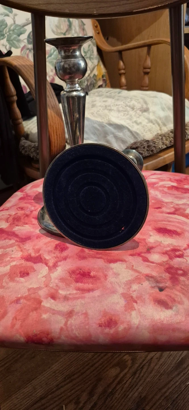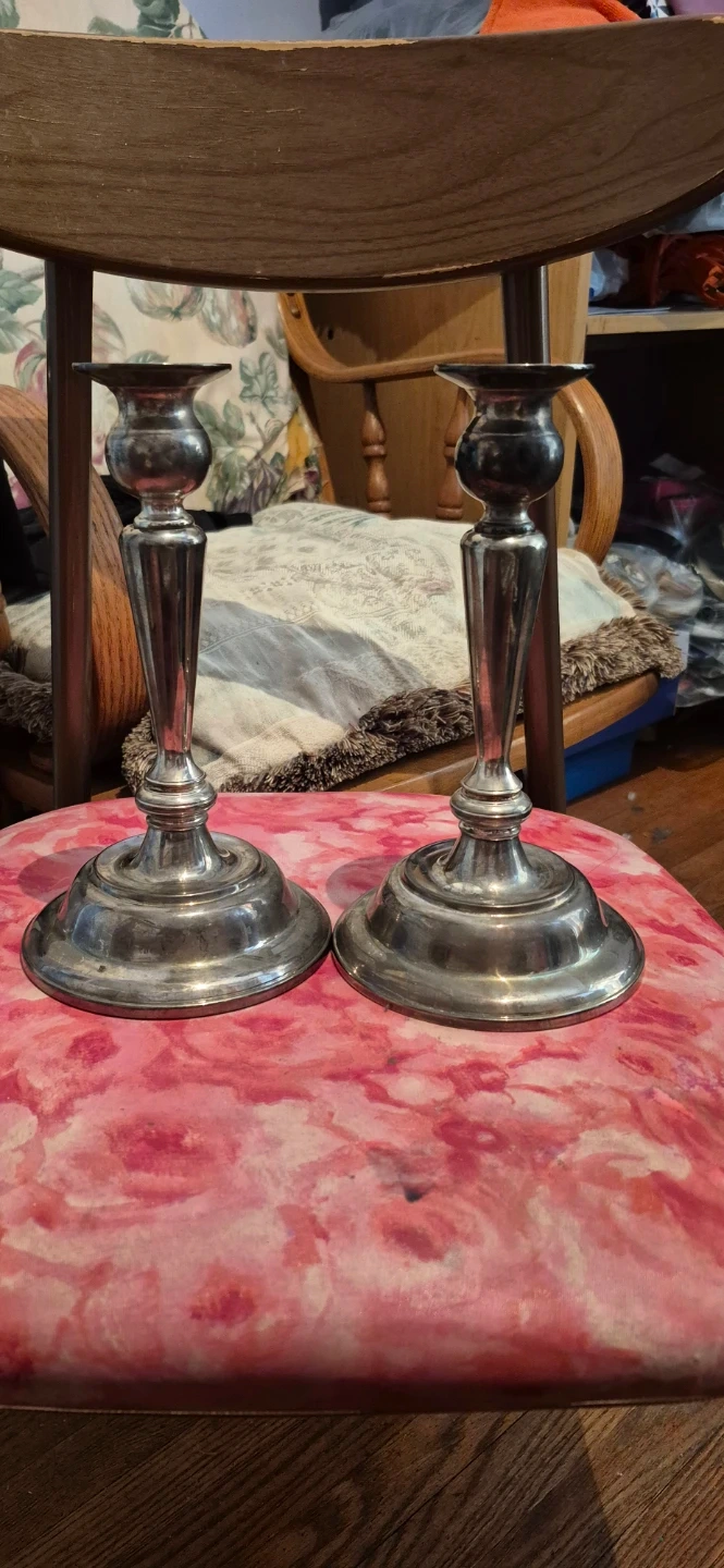 This pair of candlesticks is silver-plated over zinc. They have a classic design with a felted base. They're perfect for adding a touch of elegance to any table setting or mantelpiece.