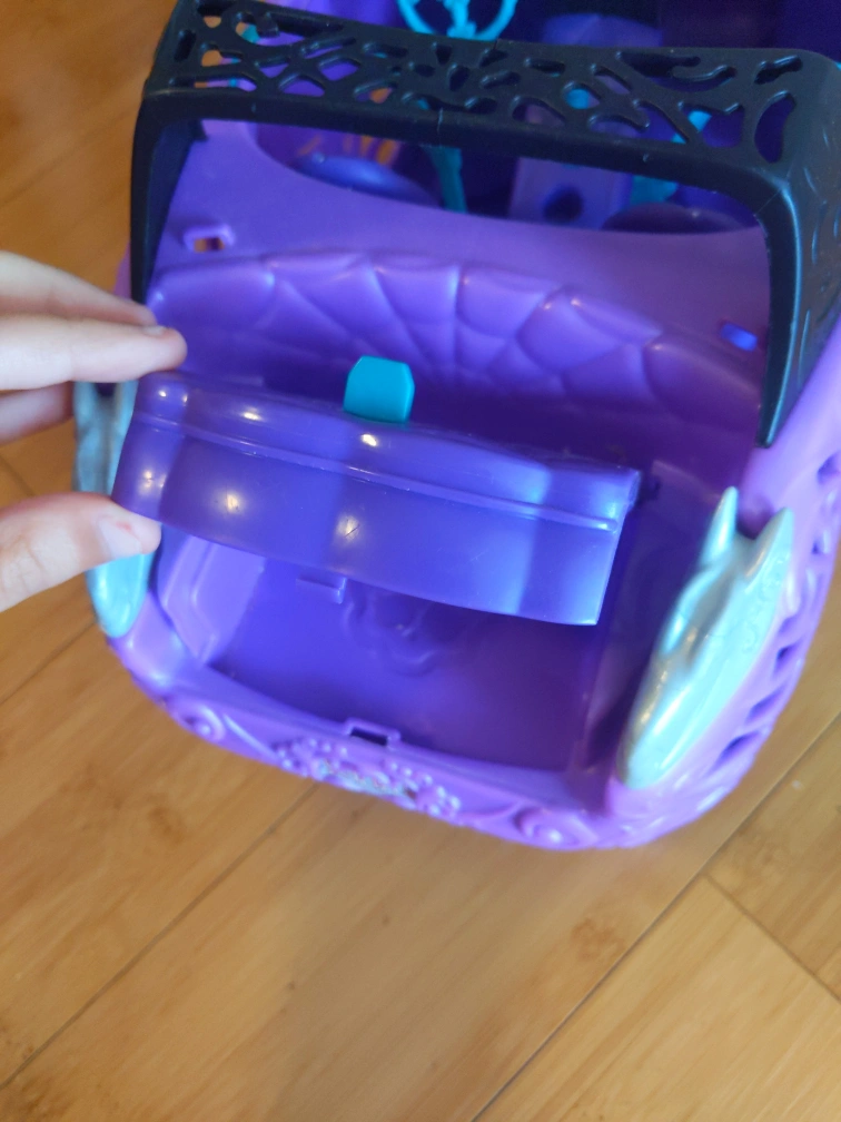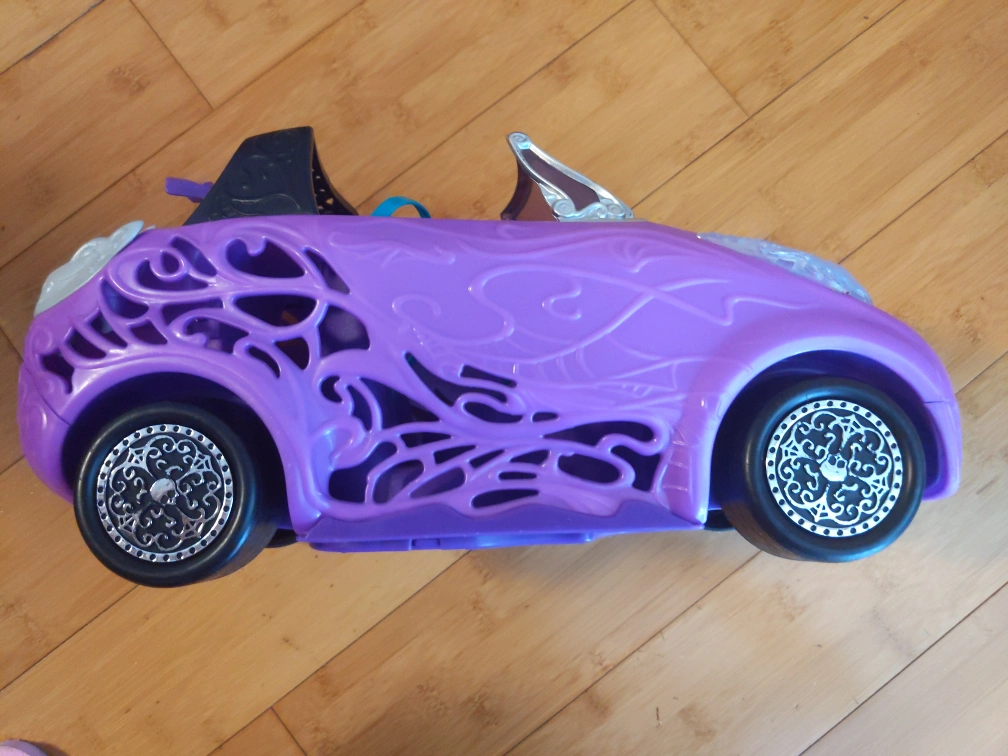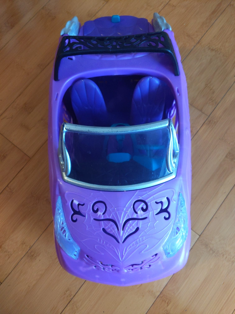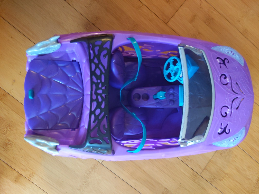 Purple convertible car with working doors and a trunk. This car has a little crack at the black part, but it's not noticeable. It has seats and seatbelts and can fit Barbies and dolls. Payment is cash only and pickup only please buy!