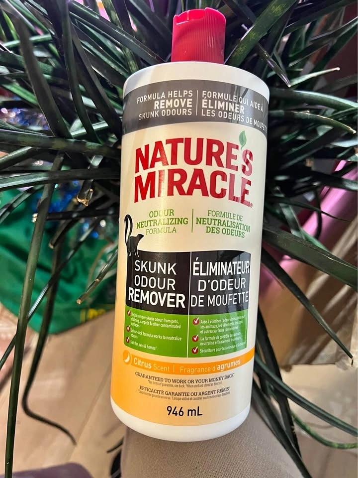 Brand new, unopened 946 mL bottle. Citrus scent. Removes skunk odours from pets, clothing, and surfaces. Pickup in Vancouver.